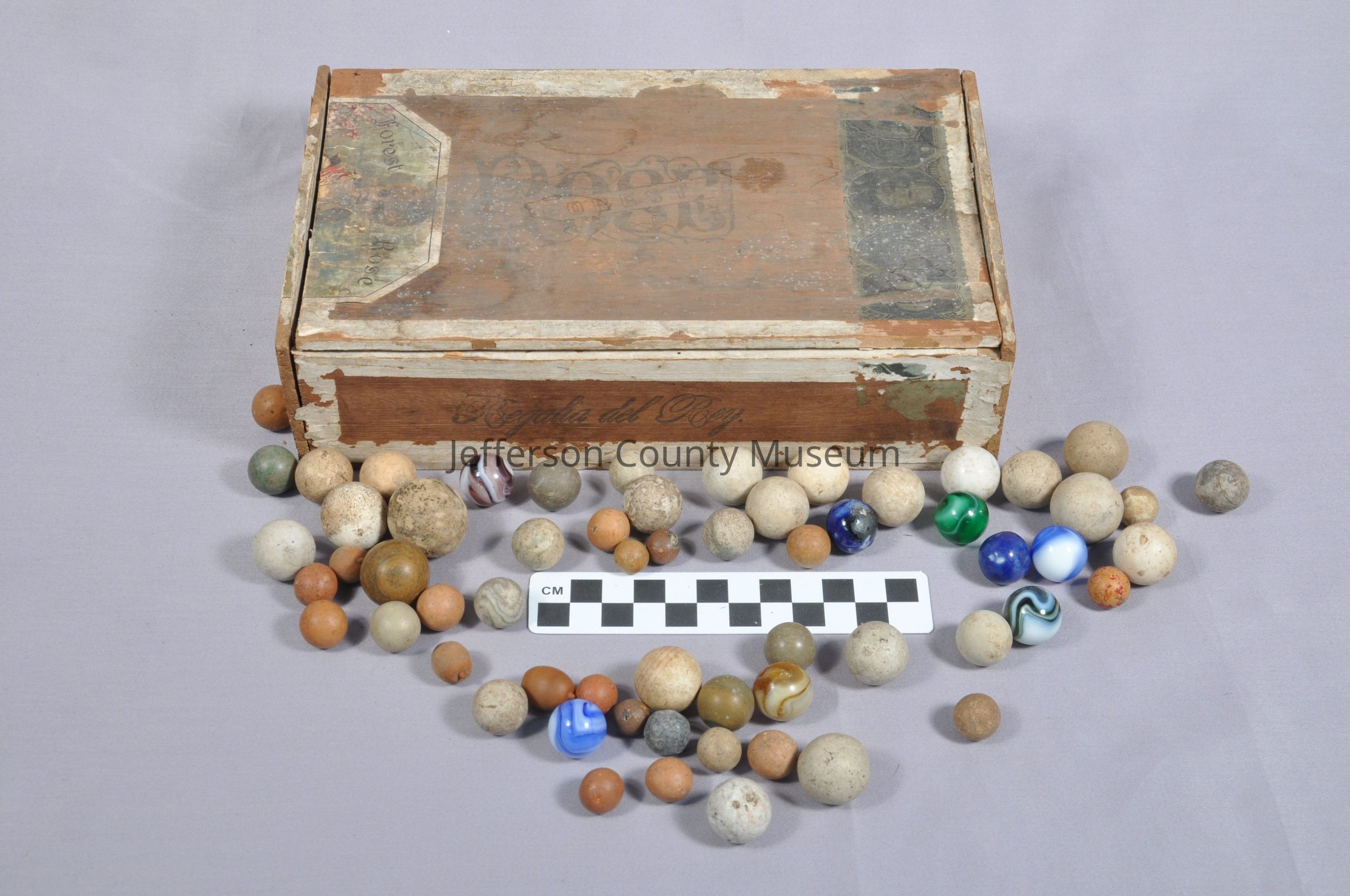 50 clay marbles, eight glass marbles, and three small acorns in a wooden cigar box that says "FOREST ROSE" on it.Acquisition