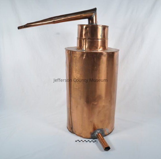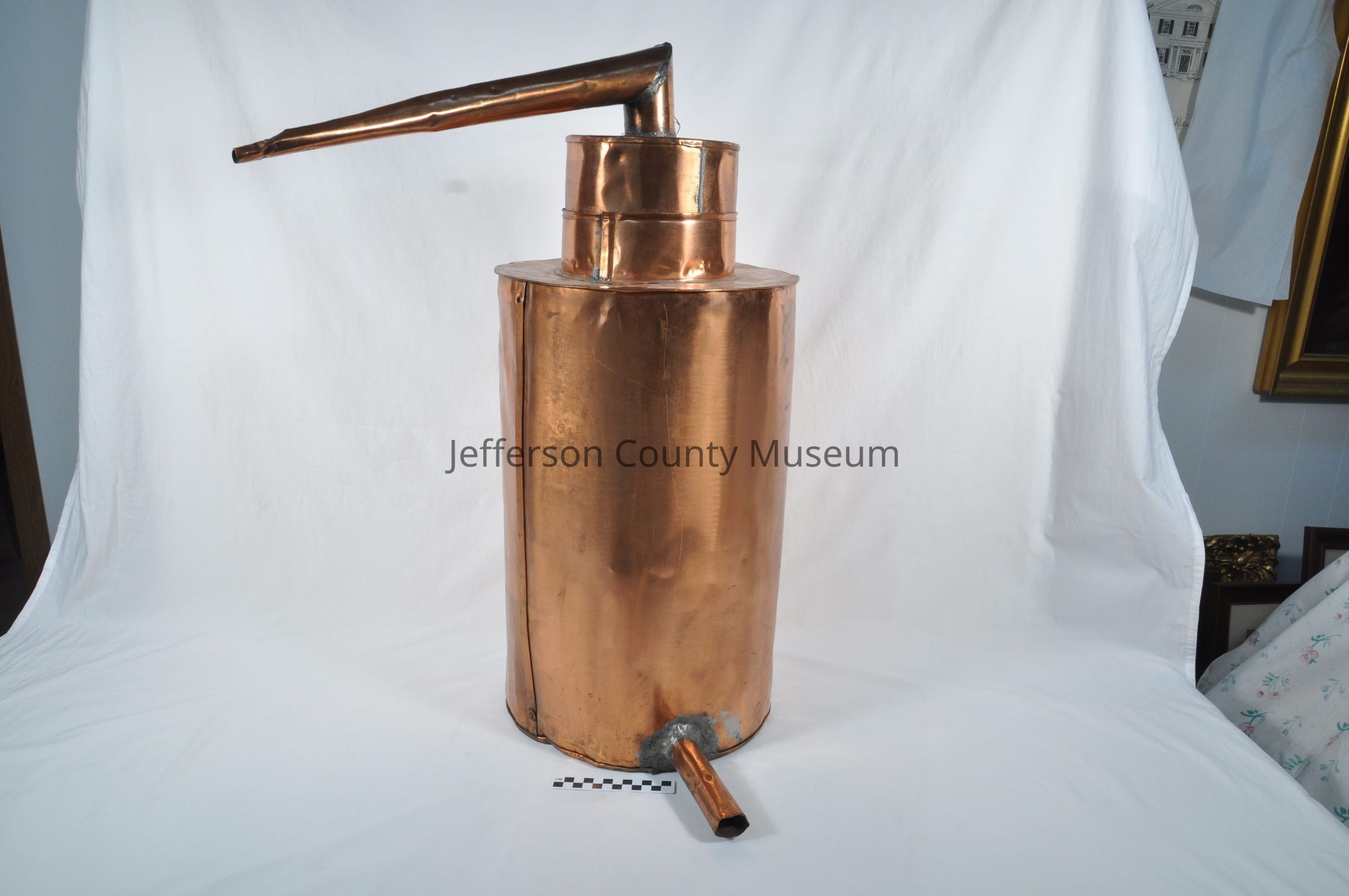 Cylindrical copper still with cap and stilling arm soldered onto the cap. Tube at bottom for attaching to the mash tub.