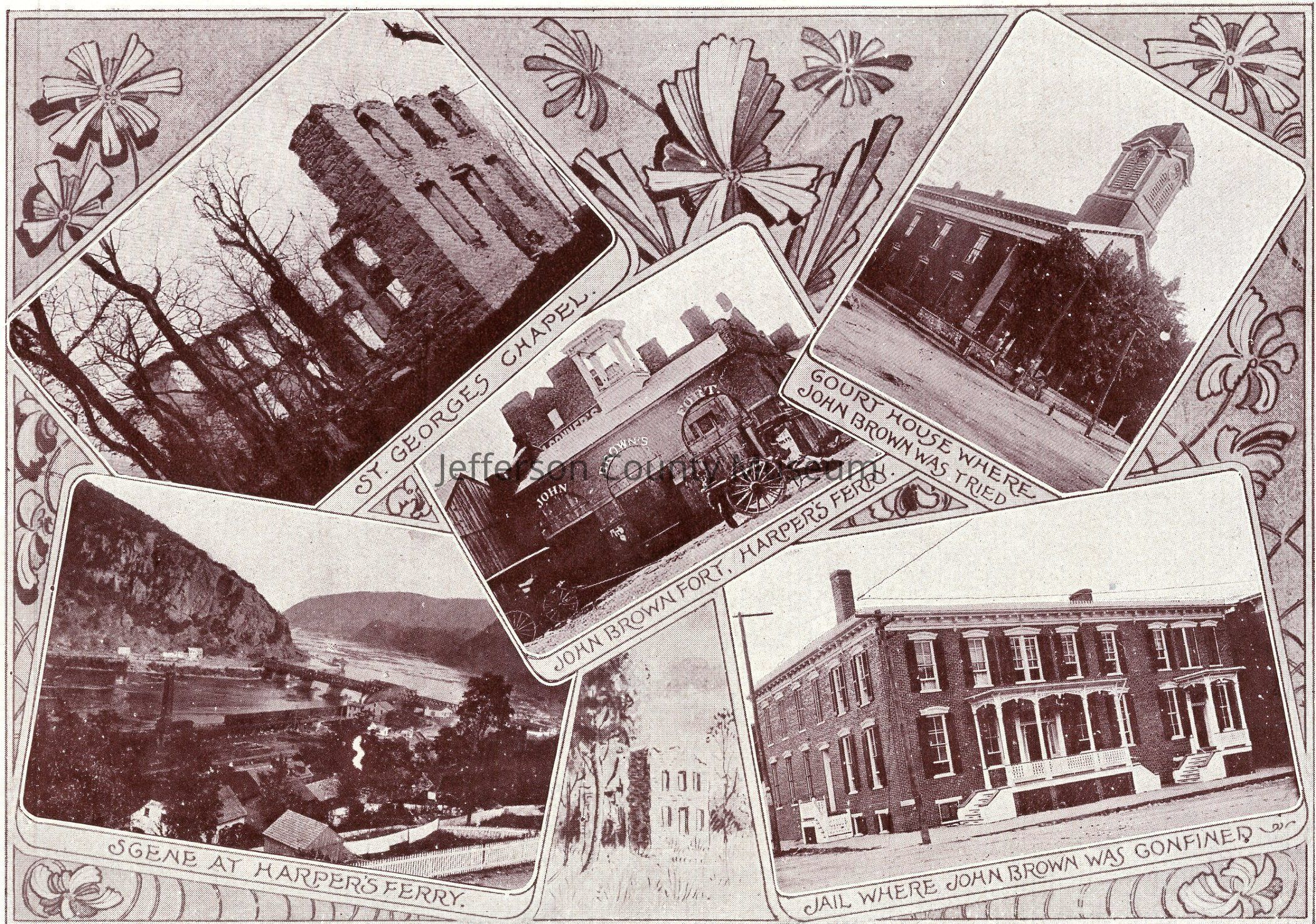 Collage of St. George's Chapel; Scene at Harpers Ferry; John Brown fort, Harpers Ferry; Court House Where John Brown was Tried; Jail where John Brown was confined. (No.18)