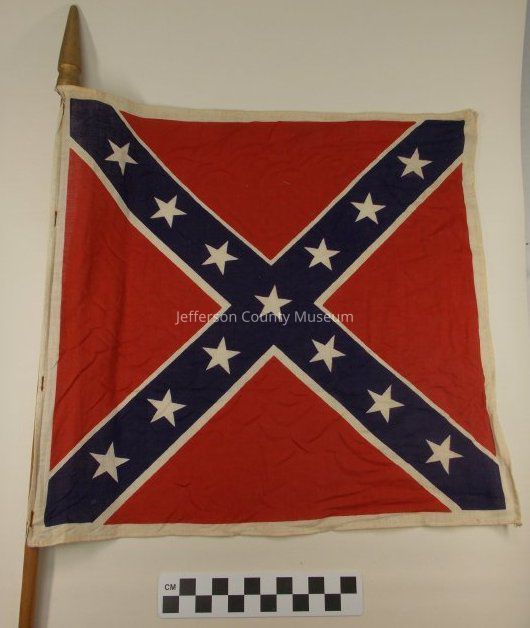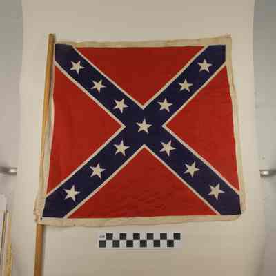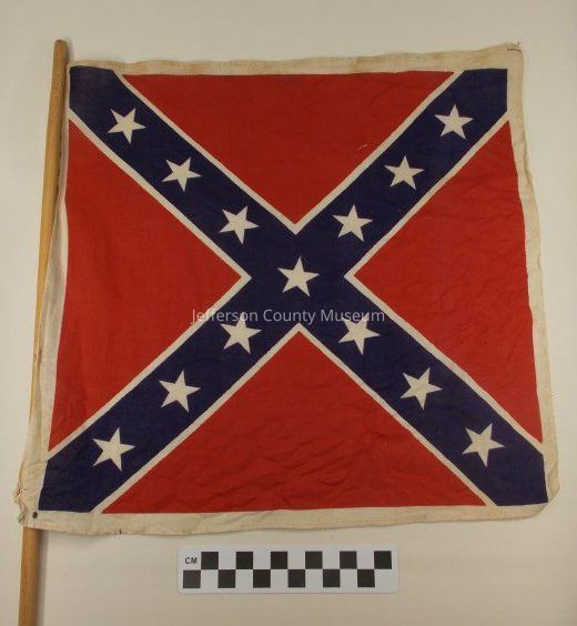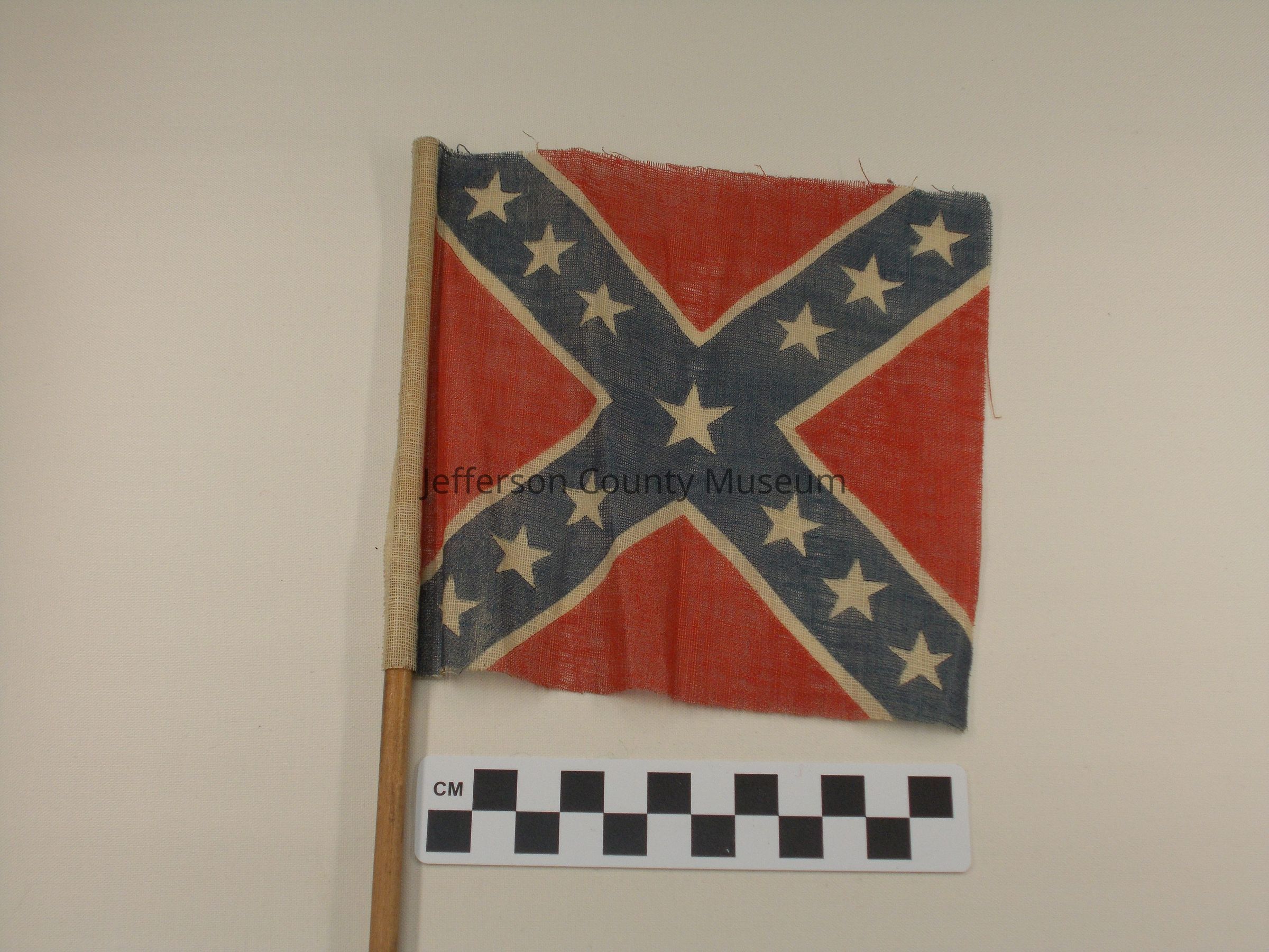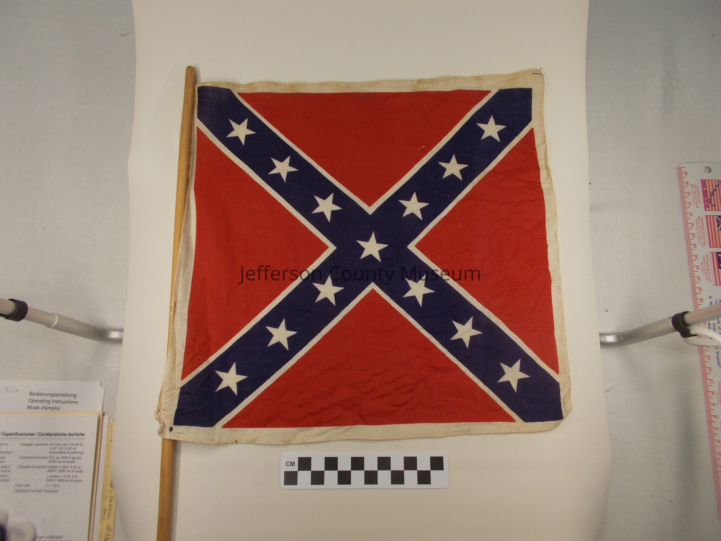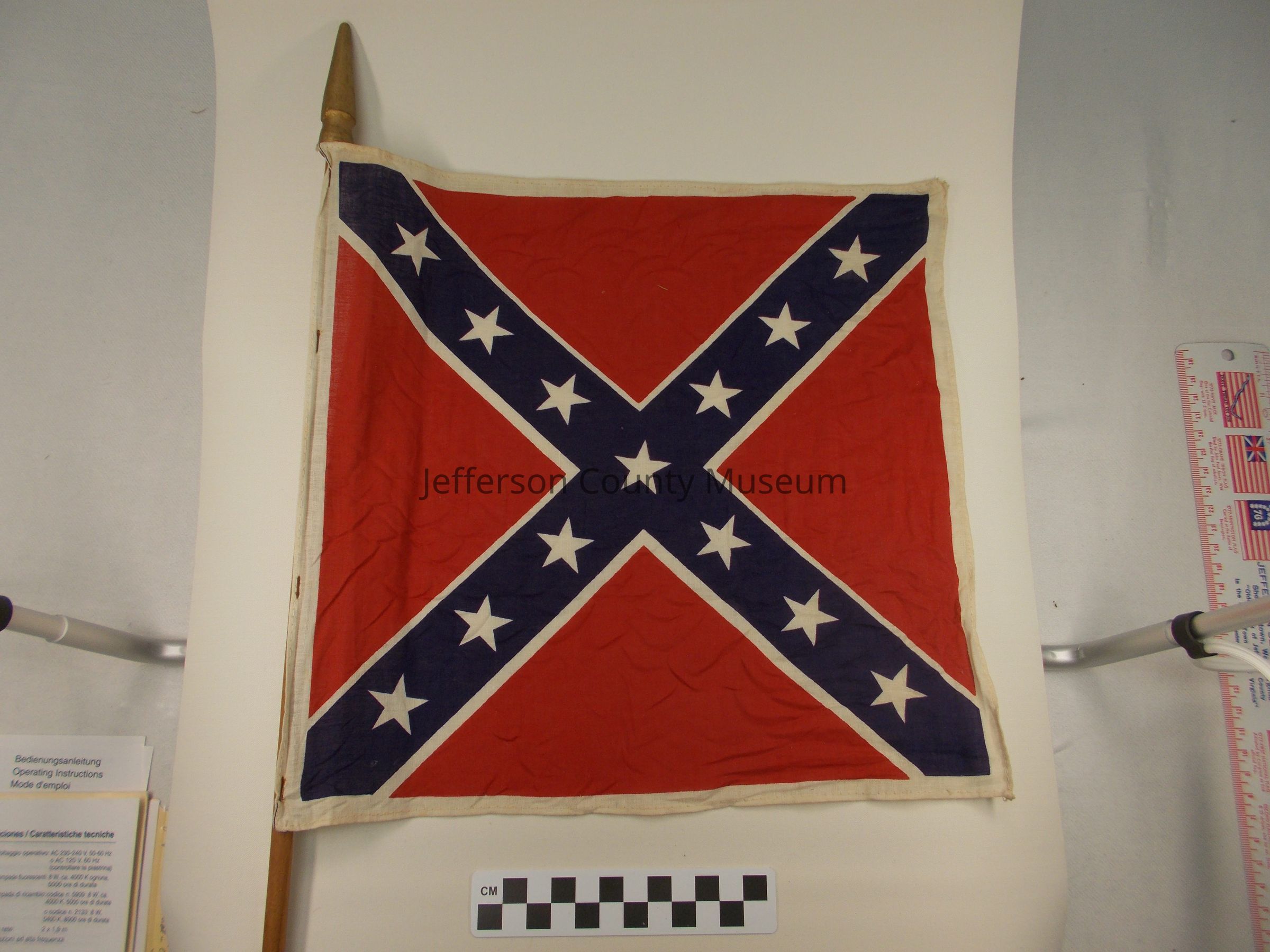 Five Confederate battle flags of varying sizes and one third national flag of the Confederacy.