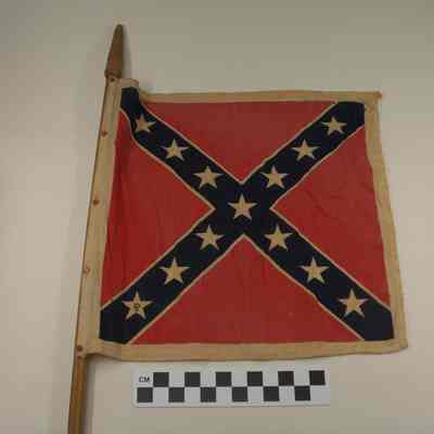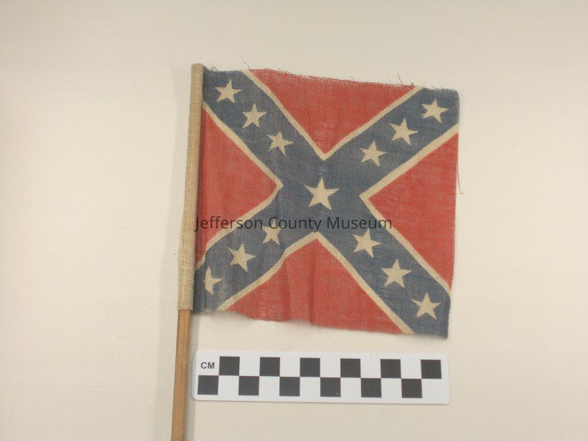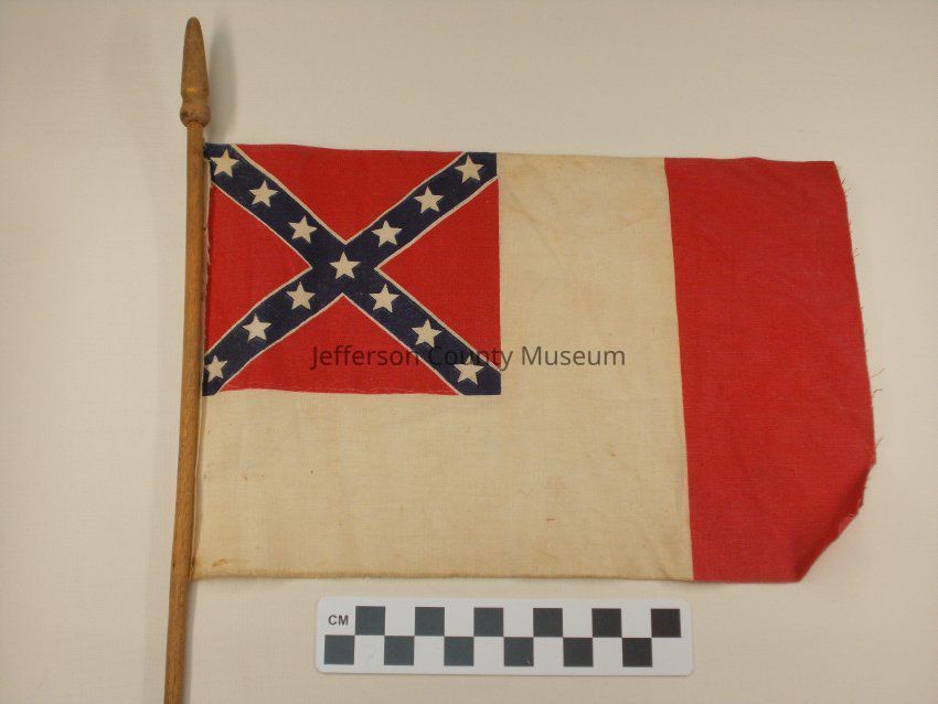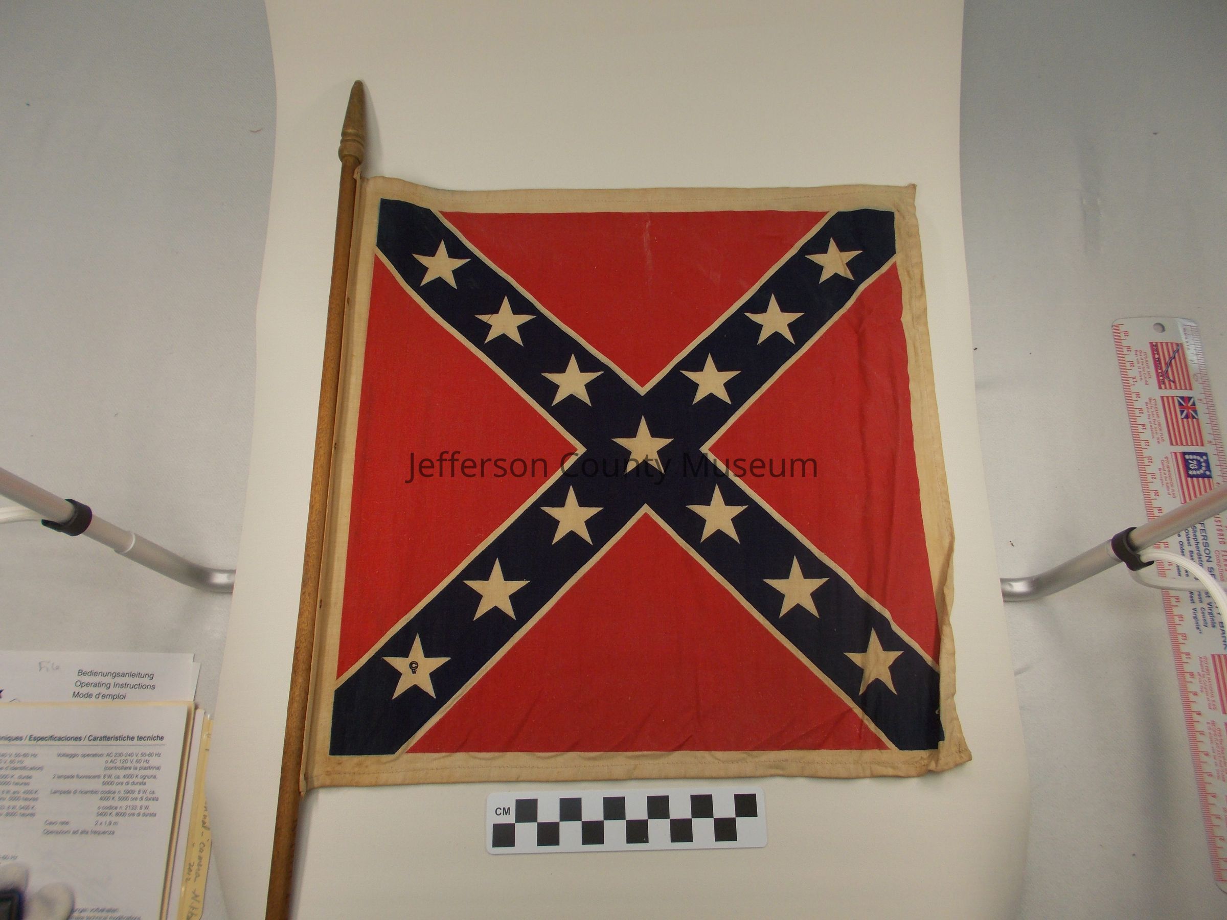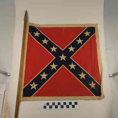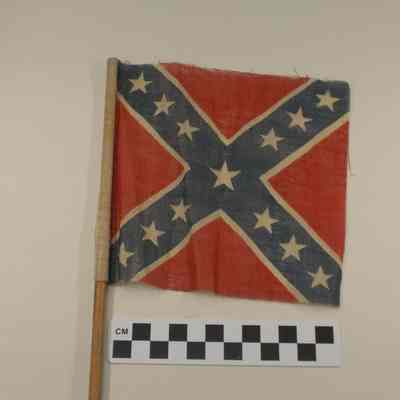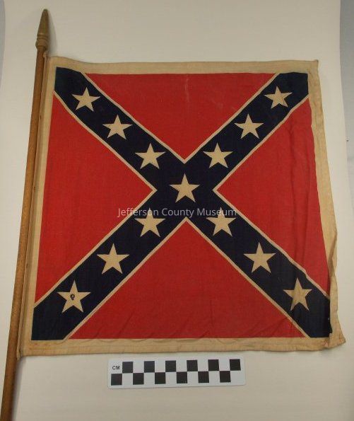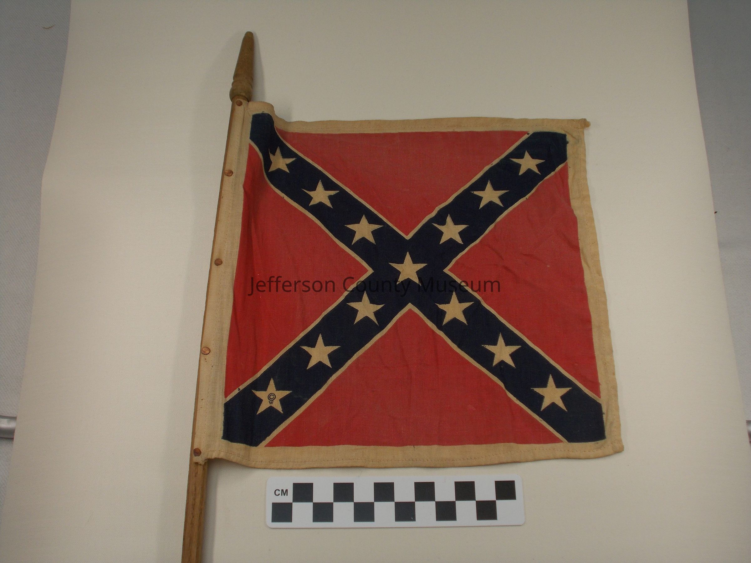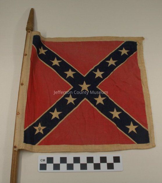 Five Confederate battle flags of varying sizes and one third national flag of the Confederacy.