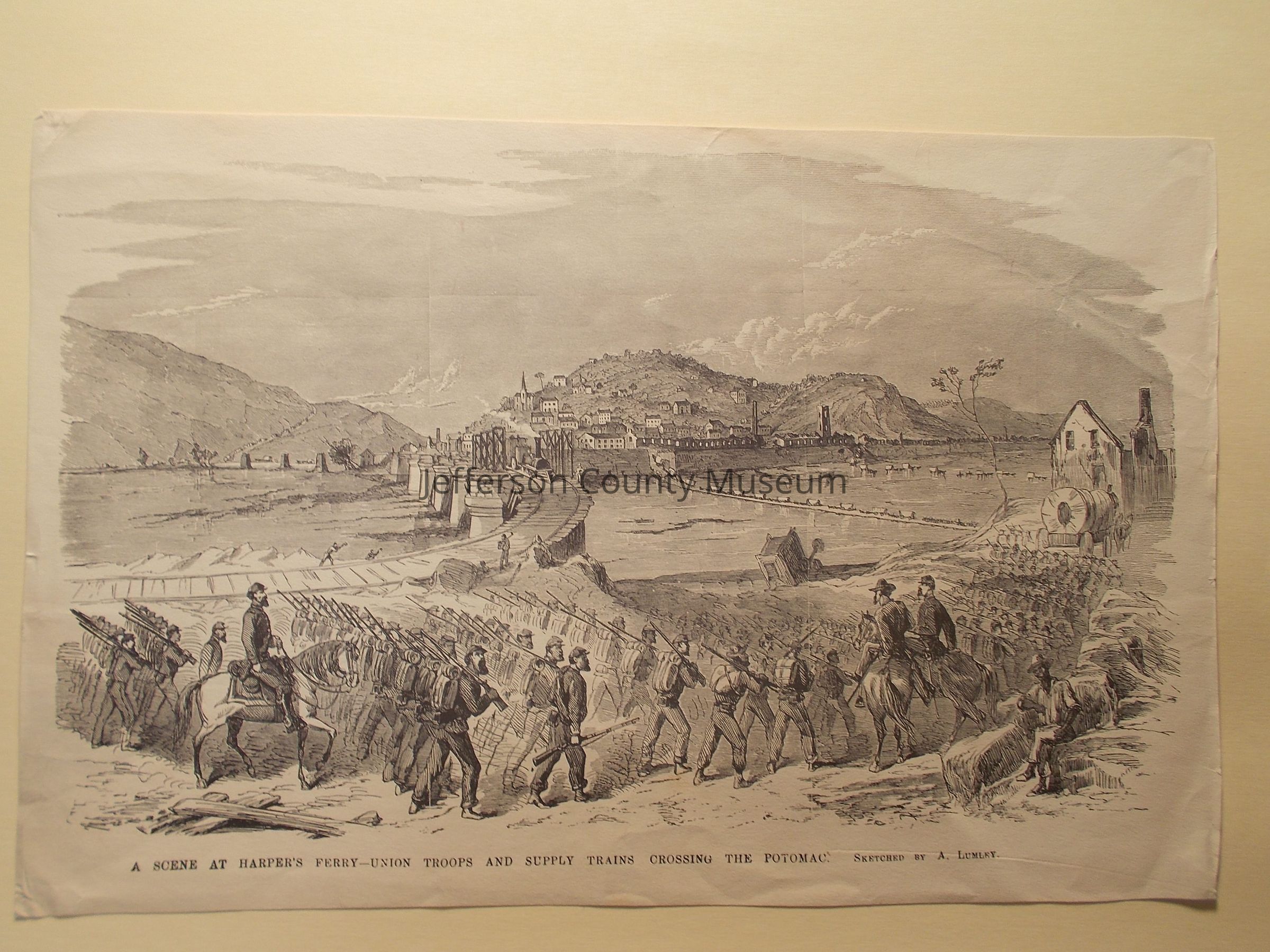 A Scene at Harper's Ferry-- Union Troops and Supply Trains Crossing the Potomac. Sketched by A. Lumley.Entry/Object ID