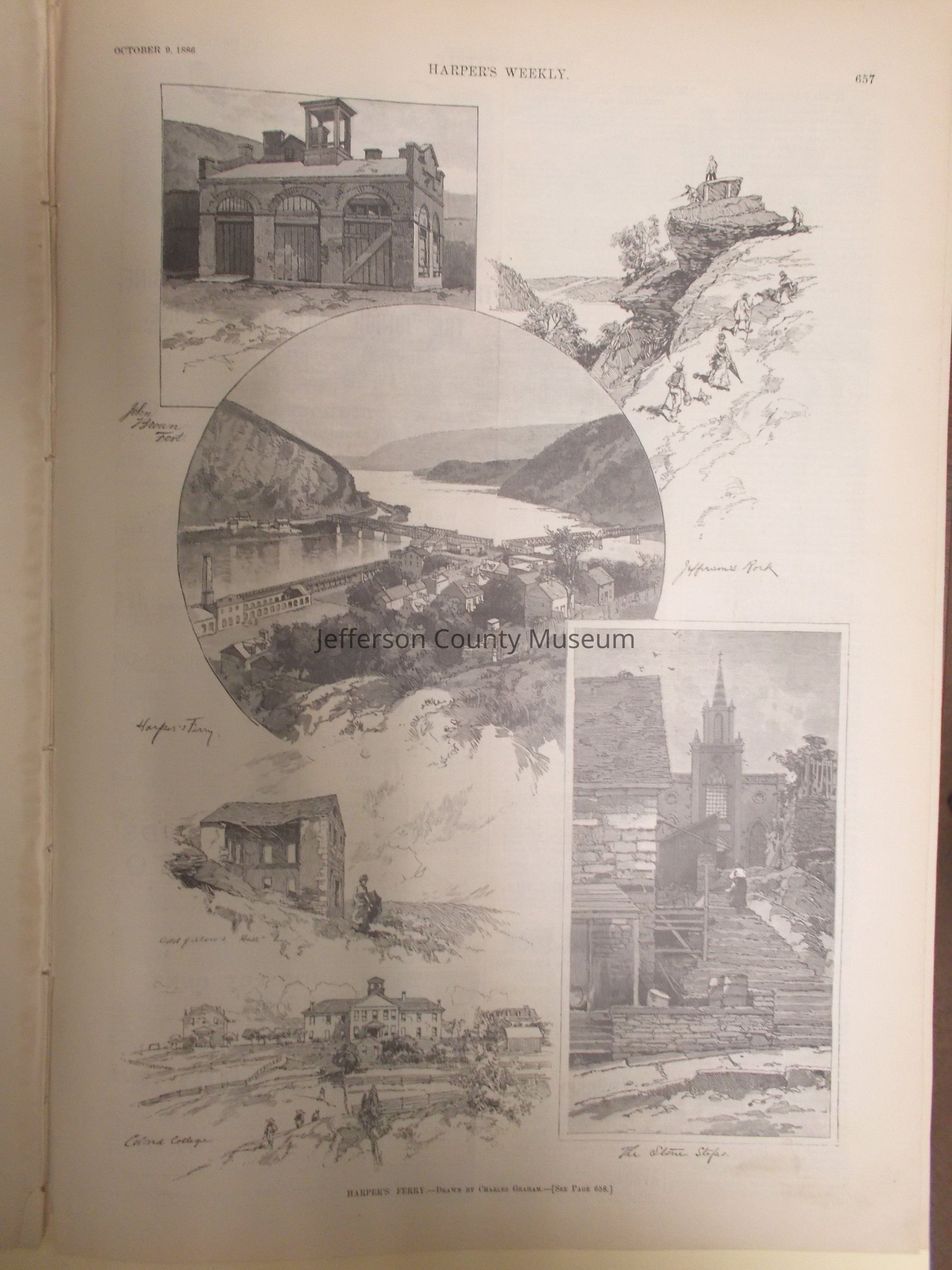 Multiple scenes in Harper's Ferry, W.Va. Scenes include St. Peter's stone steps, Jefferson's Rock, John Brown's Fort, Oddfellow's hill, the [colored?] college, and a scenic overlook of the town. From Harper's Weekly. Vol. 30, No. 1555, October 9, 1886. Pg. 657.