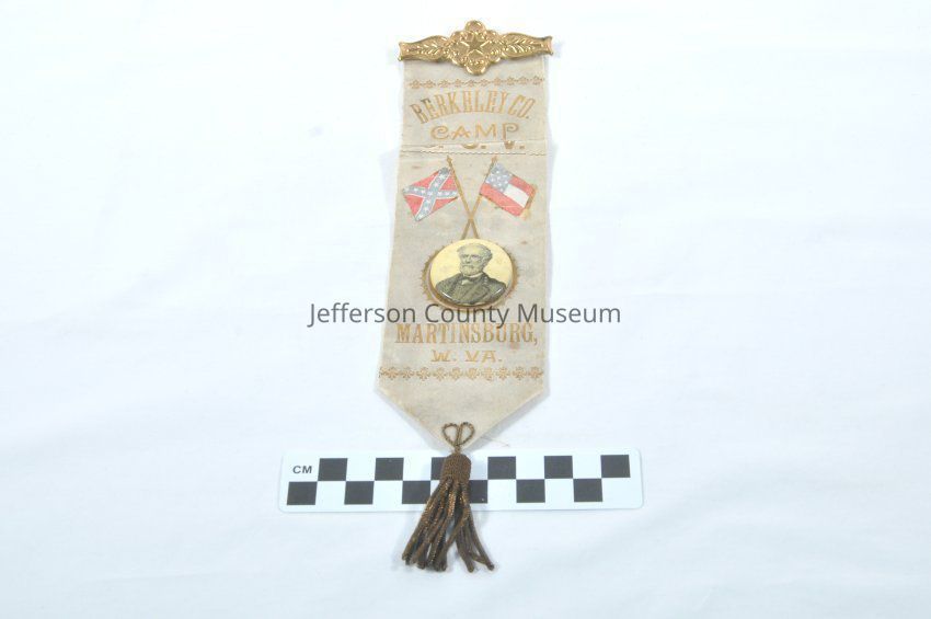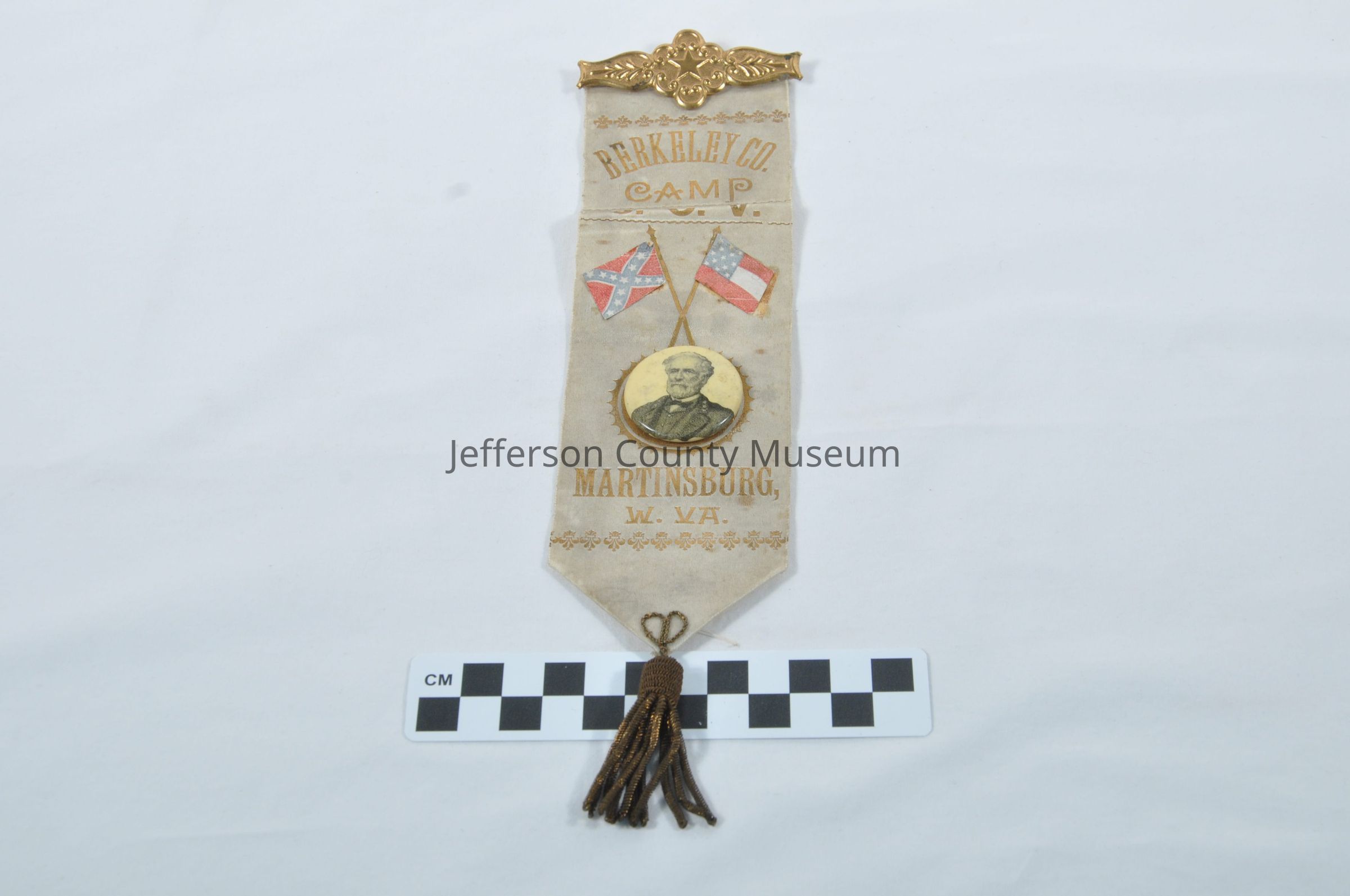 Beige ribbon with gold colored bar at top with star in center. Crossed Confederate battle flag and stars and bars above a button with Robert E. Lee on it. Ribbon says "BERKELEY CO. CAMP S. C. V. MARTINSBURG, W. VA.". Brass coiled wire tassel at bottom.Acquisition