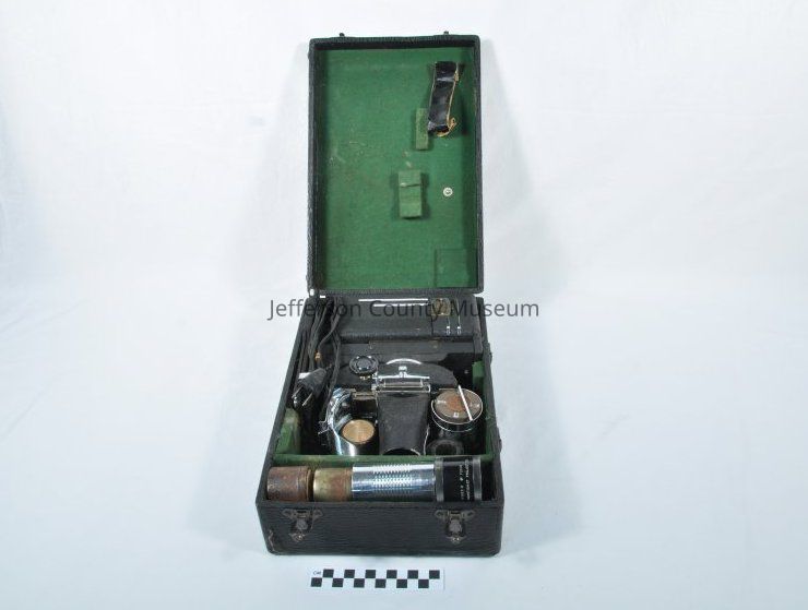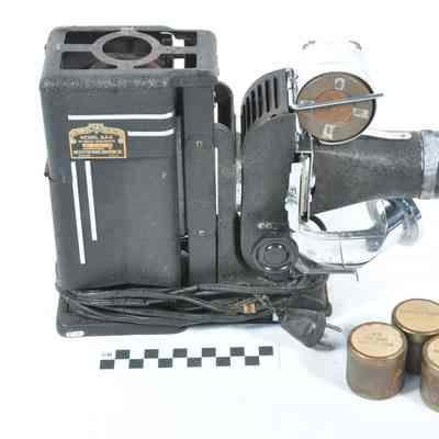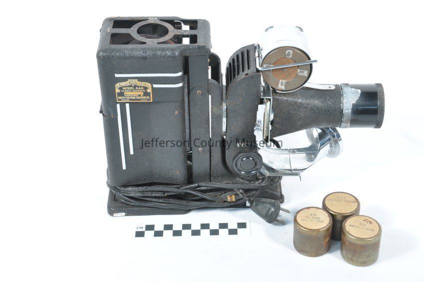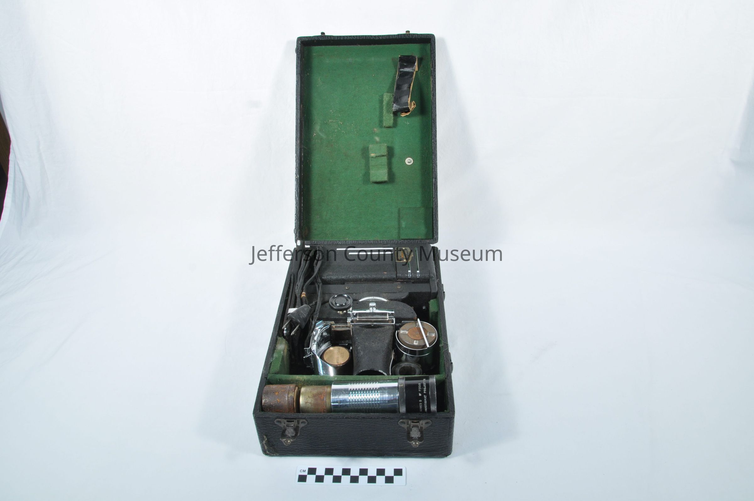 Electric film-strip projector with lens and three cans with film. There is another film rolled up not in a can. Electric cord wrapped around bottom of projector. Film was advanced frame by frame by hand. Projector is in a hard case covered with black Leatherette. The case is lined with green felt. Metal tag on side of projector says "TRI-PURPOSE PROJECTOR SVE MODEL AAA 115 VOLTS .. 300 WATTS NO.13122 MANUFACTURED BY SOCIETY FOR VISUAL EDUCATION, INC. CHICAGO U.S.A.".Acquisition
