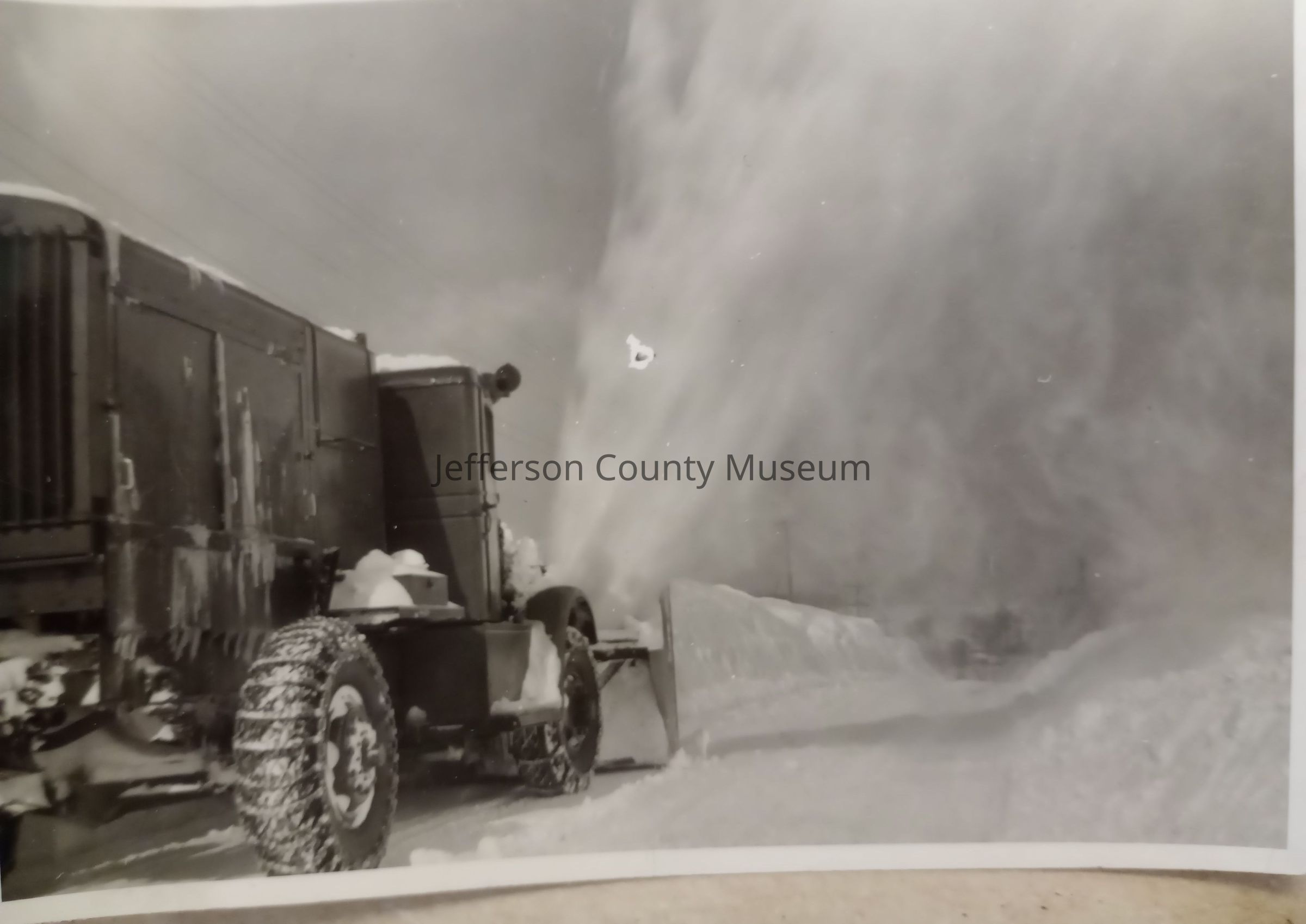 Black and white photo of a snowplow driving on Rte. 51 near Altona, home of the Davenports, likely after the blizzard of 1966.Acquisition