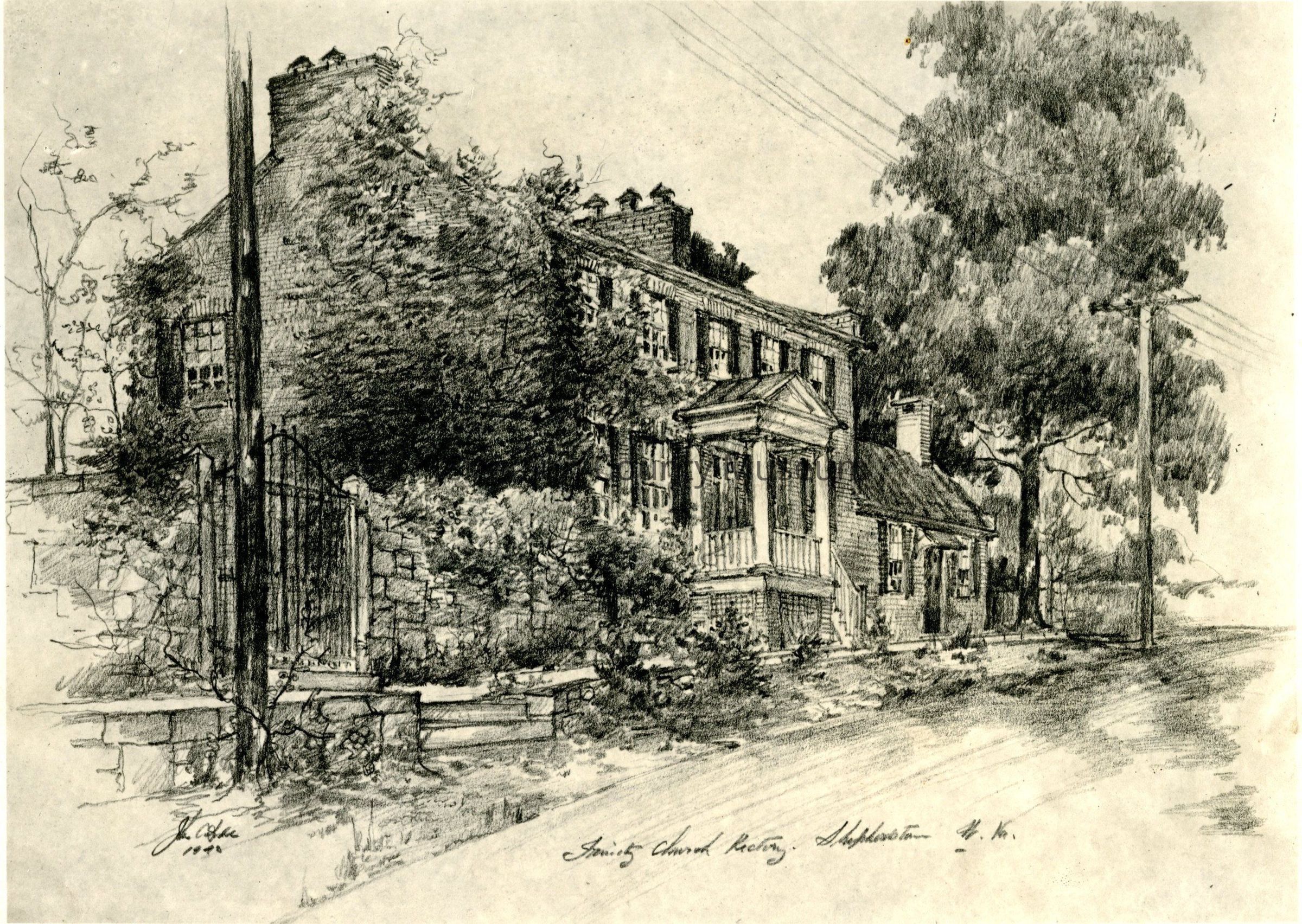 Reproduction of drawing of Trinity Episcopal Church Rectory and Shepherd family cemetery, Shepherdstown. Artist John C-?Acquisition