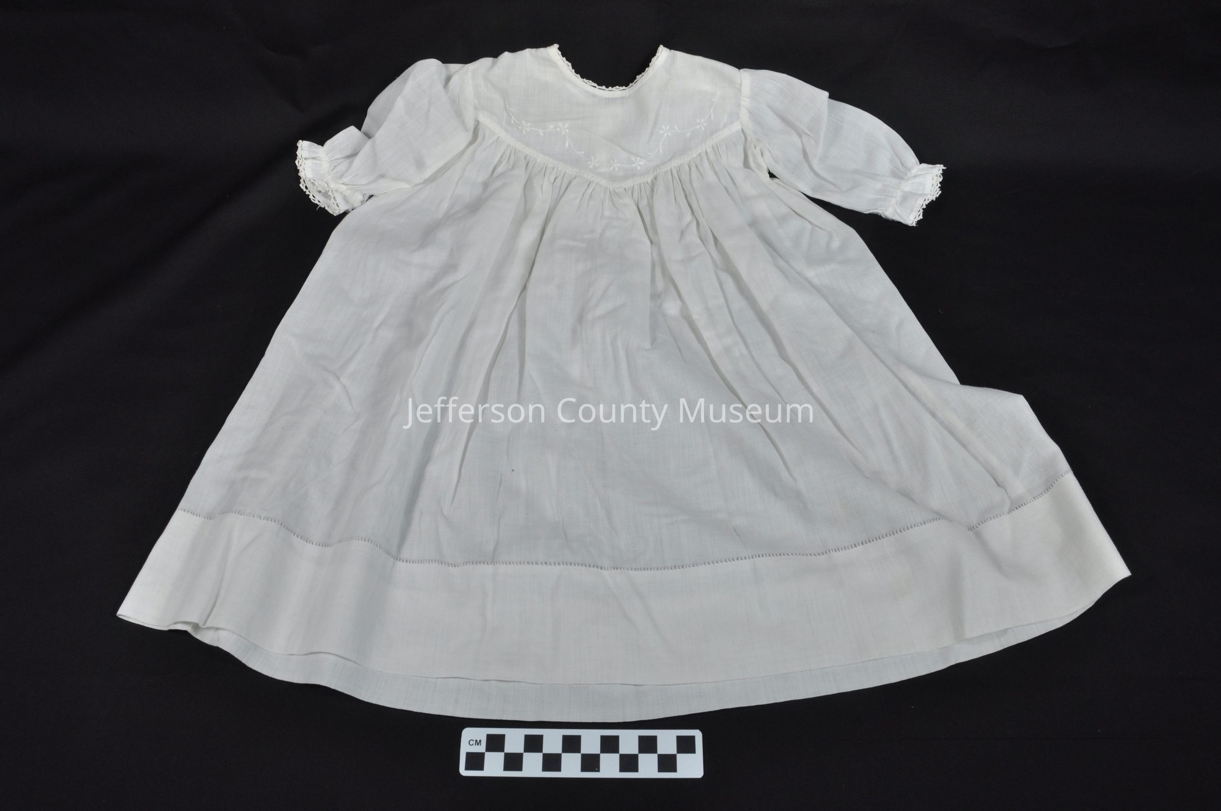Child's white dress with simple floral pattern embroidered on bodice. Two buttons in back.Acquisition