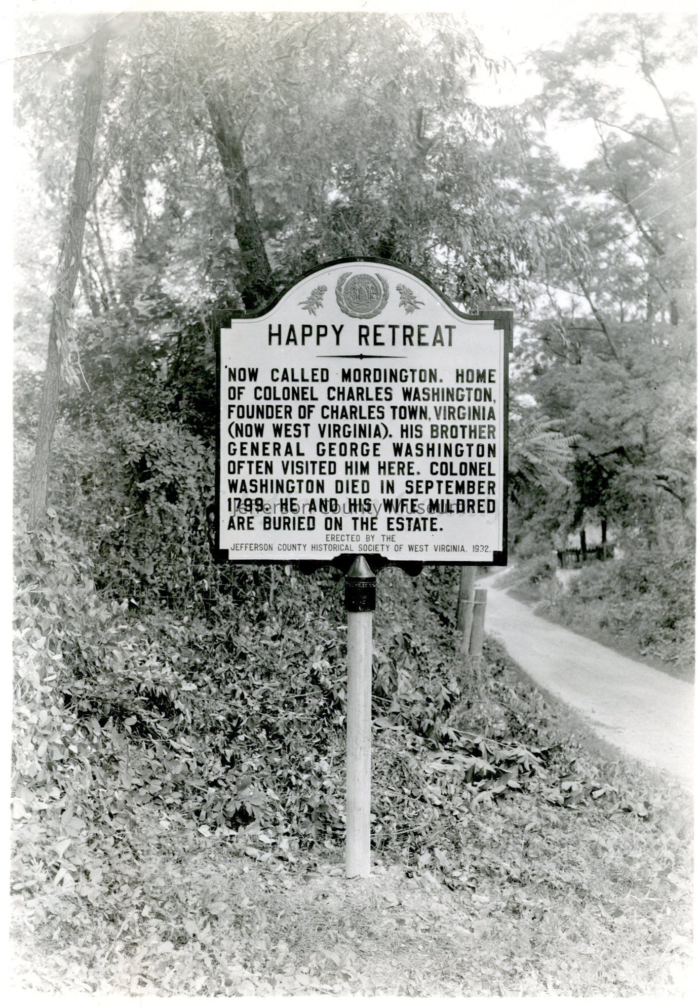 Historical marker at "Happy Retreat" erected in 1932. Text: "Happy Retreat - Now called Mordington. Home of Colonel Charles Washington, founder of Charles Town, Virginia (now West Virginia). His brother General George Washington often visited him here. Colonel Washington died in September 1799. He and his wife Mildred are buried on the estate."Acquisition