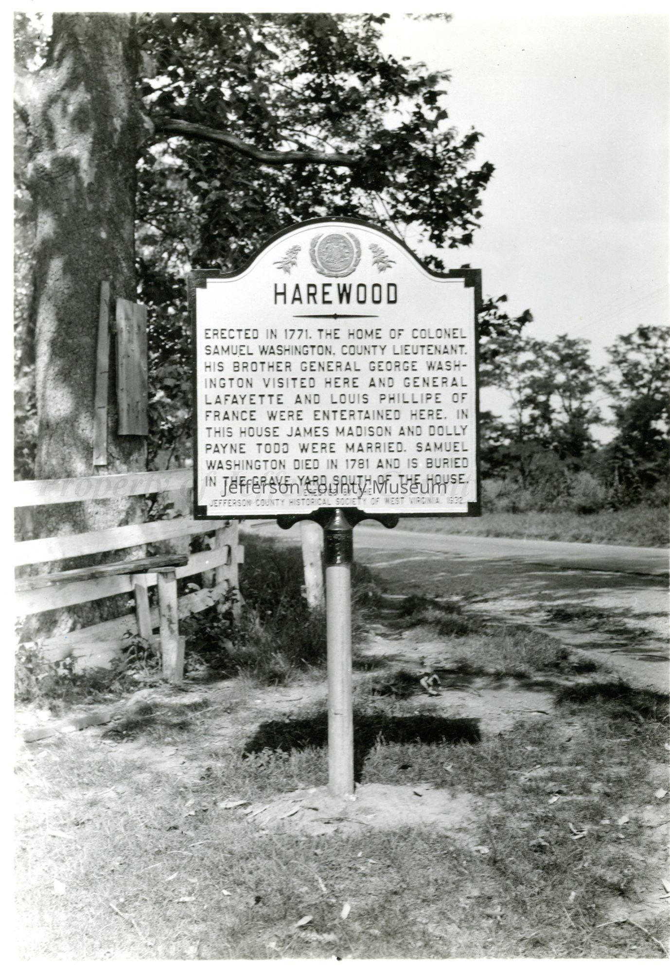 Historical marker at "Harewood" erected in 1932. Text: "Harewood - Erected in 1771, the home of Colonel Samuel Washington, County Lieutenant. His brother General George Washington visited here and General Lafayette and Louis Phillipe of France were entertained here. In this house James Madison and Dolly Payne Todd were married. Samuel Washington died in 1781 and is buried in the grave yard south of the house."Acquisition