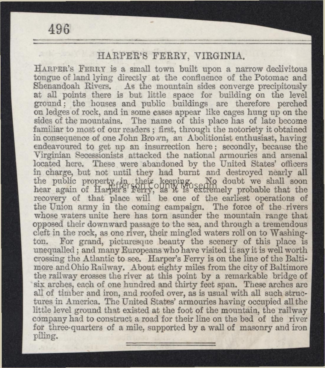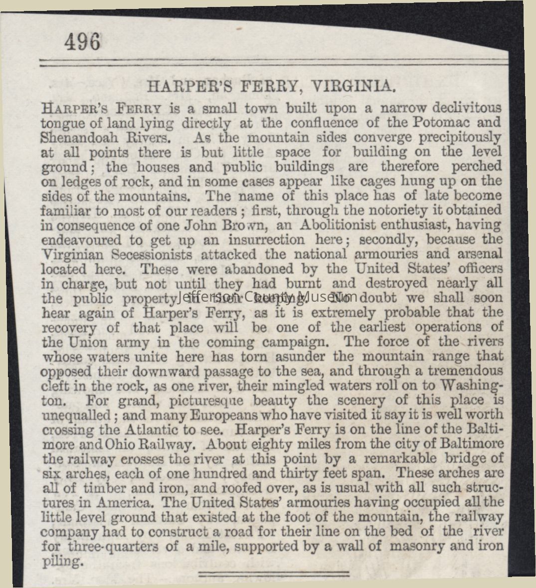 A small clipping, containing information about Harper's Ferry, is also included.Acquisition