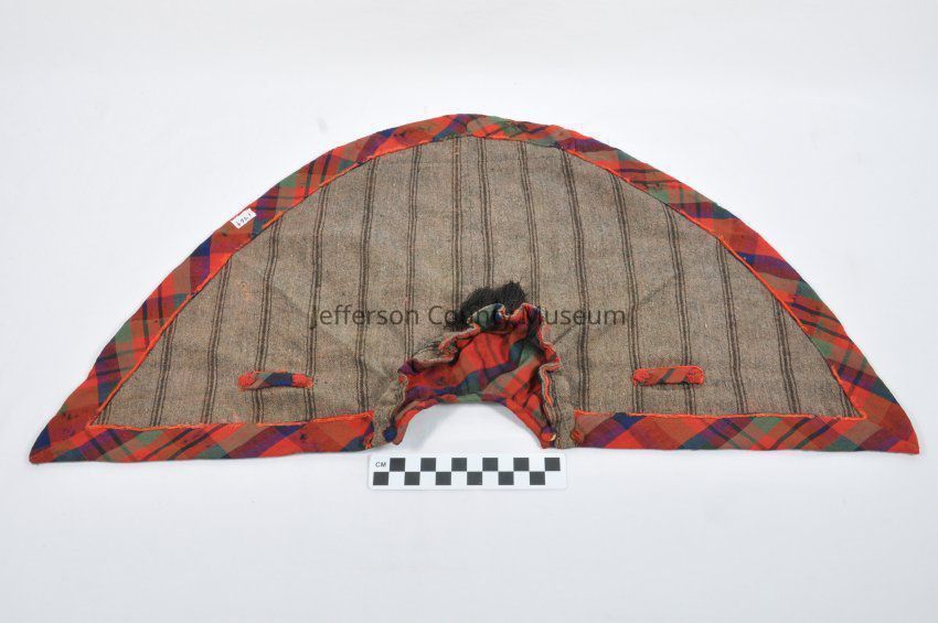Brown striped doll cape with red and green plaid trim around edges and under hood of cape. Two black tassels on hood.Acquisition