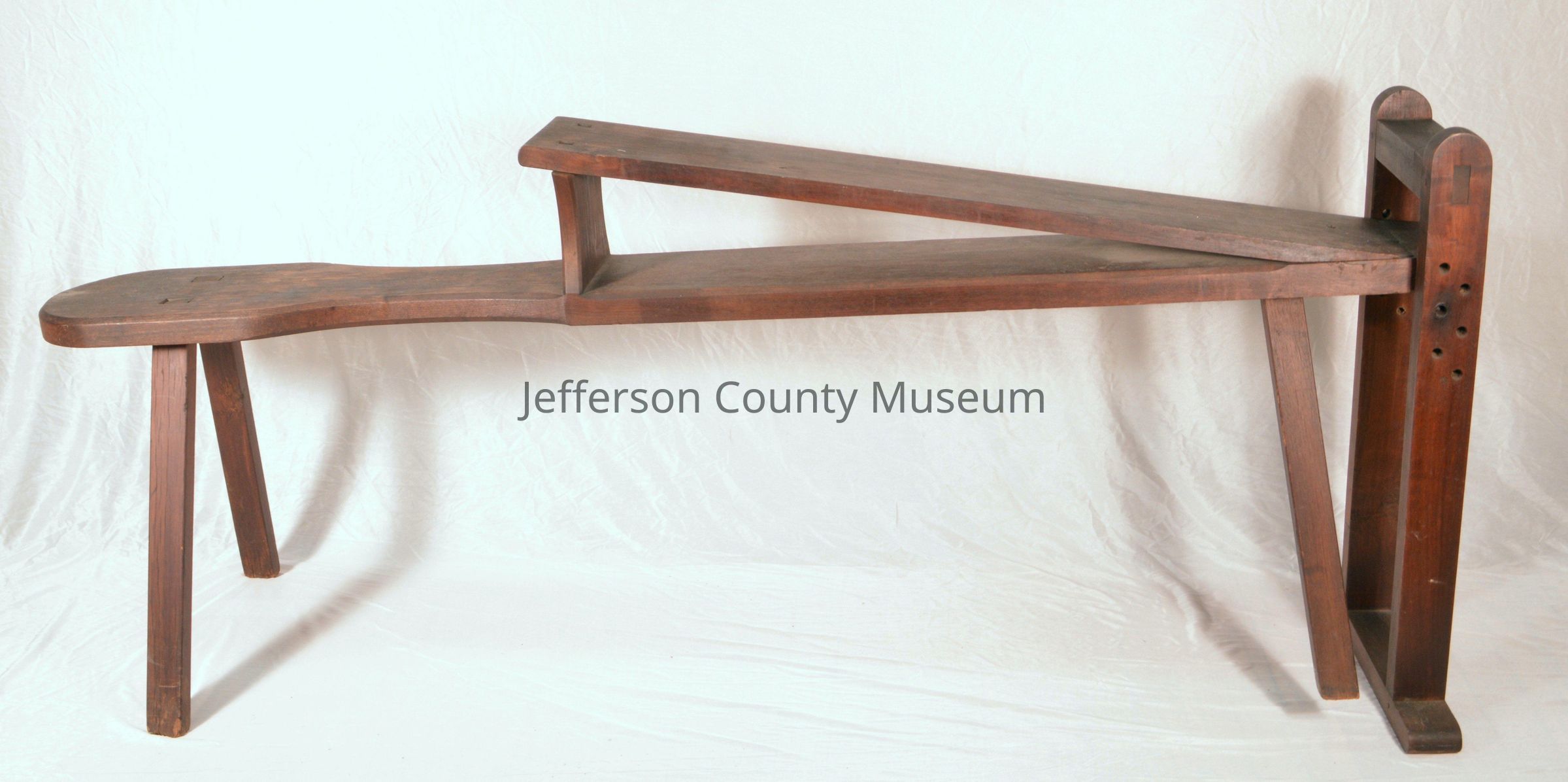Wooden shaving horse (bench) for making wagon wheel spokes or shingles. One leg is missing. Wood may be walnut.Acquisition
