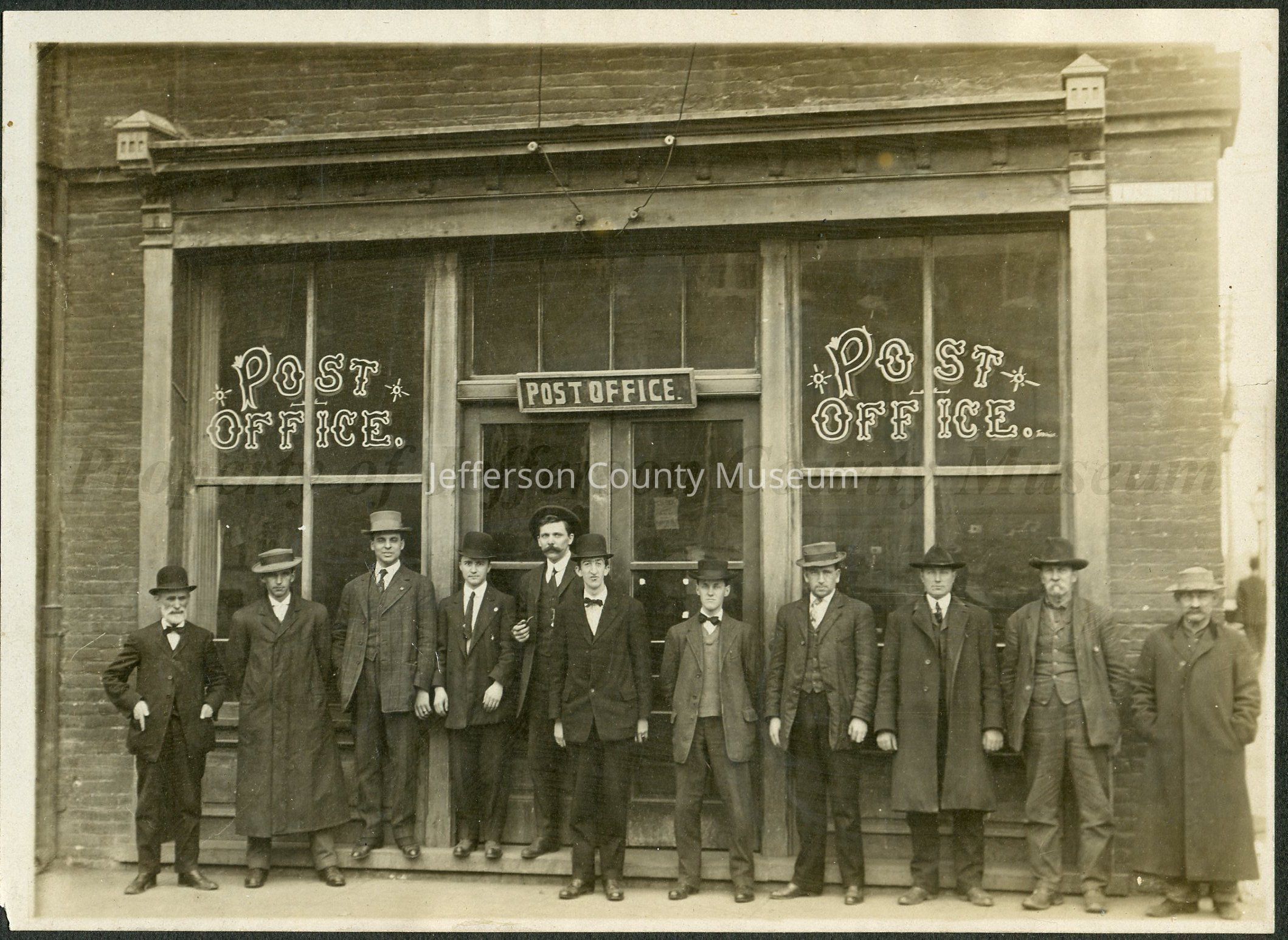 Eleven unidentified men standing in front of Post OfficeEntry/Object ID