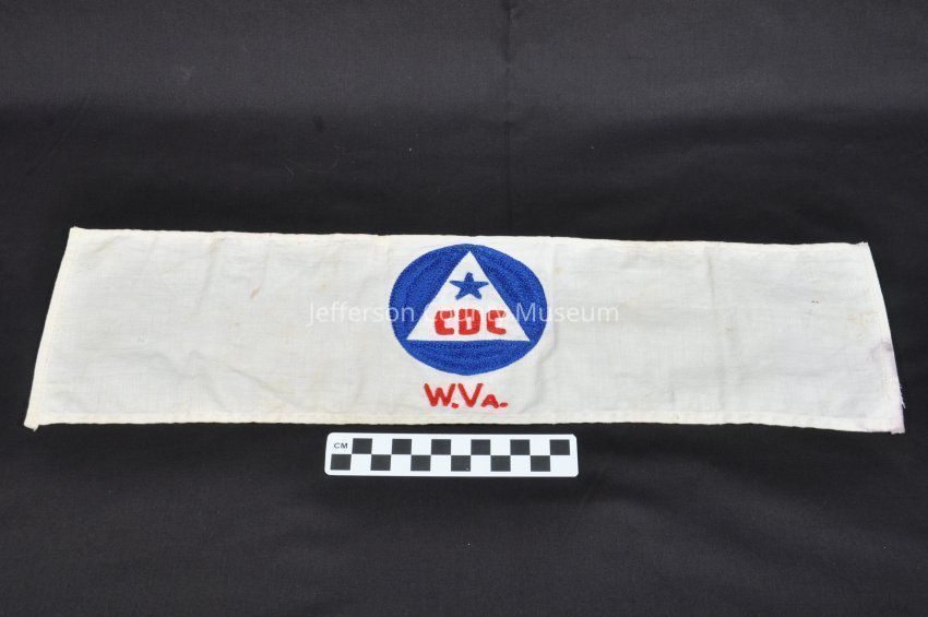 Off-white cotton armband with blue and red insignia. The insignia is a blue circle with a white triangle inside of which is a star over "CDC" Below the circle is "W.Va." in red.Acquisition