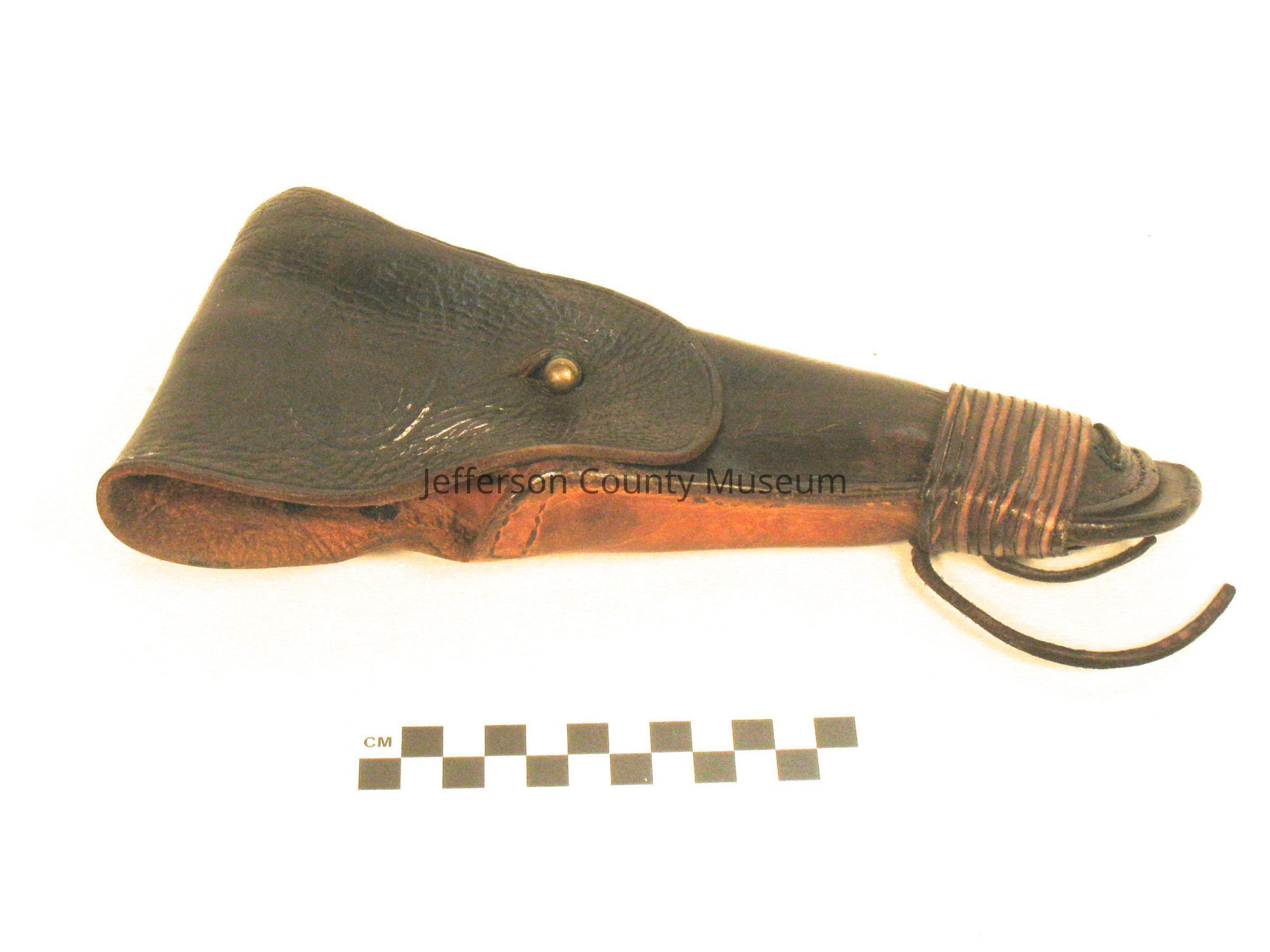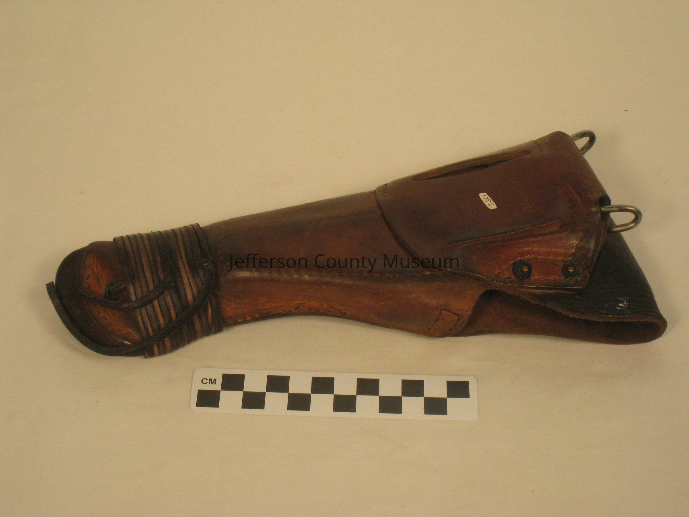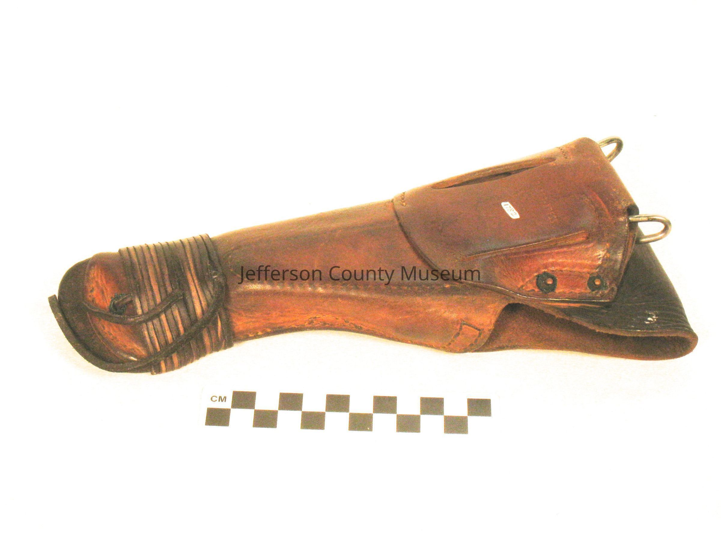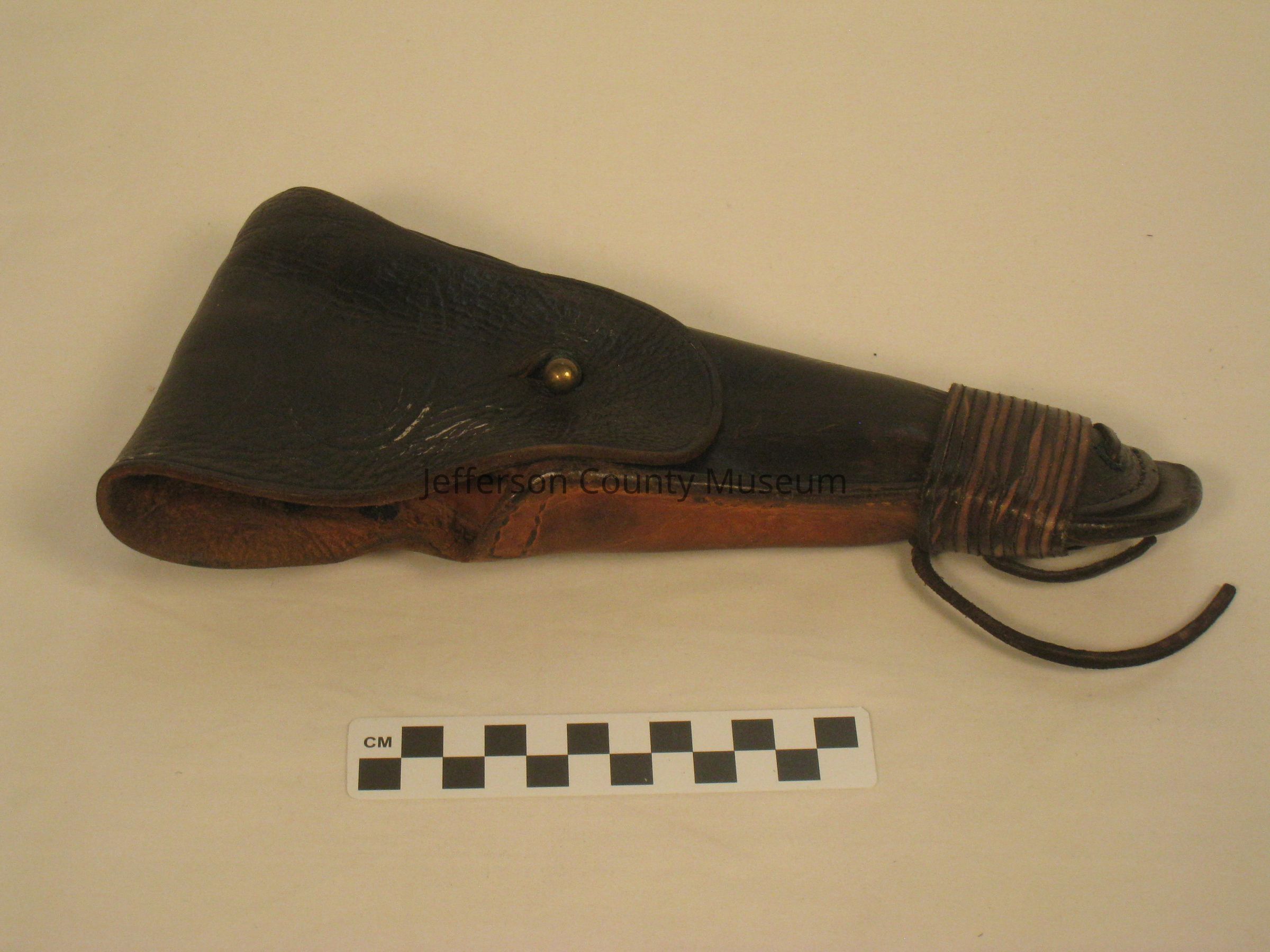 World War I holster for 1911 .45 caliber pistol. A piece of rawhide leather has been wrapped around bottom of holster. "US" in oval on flap closure. Stamped on back "ENGER-KRESS".Acquisition