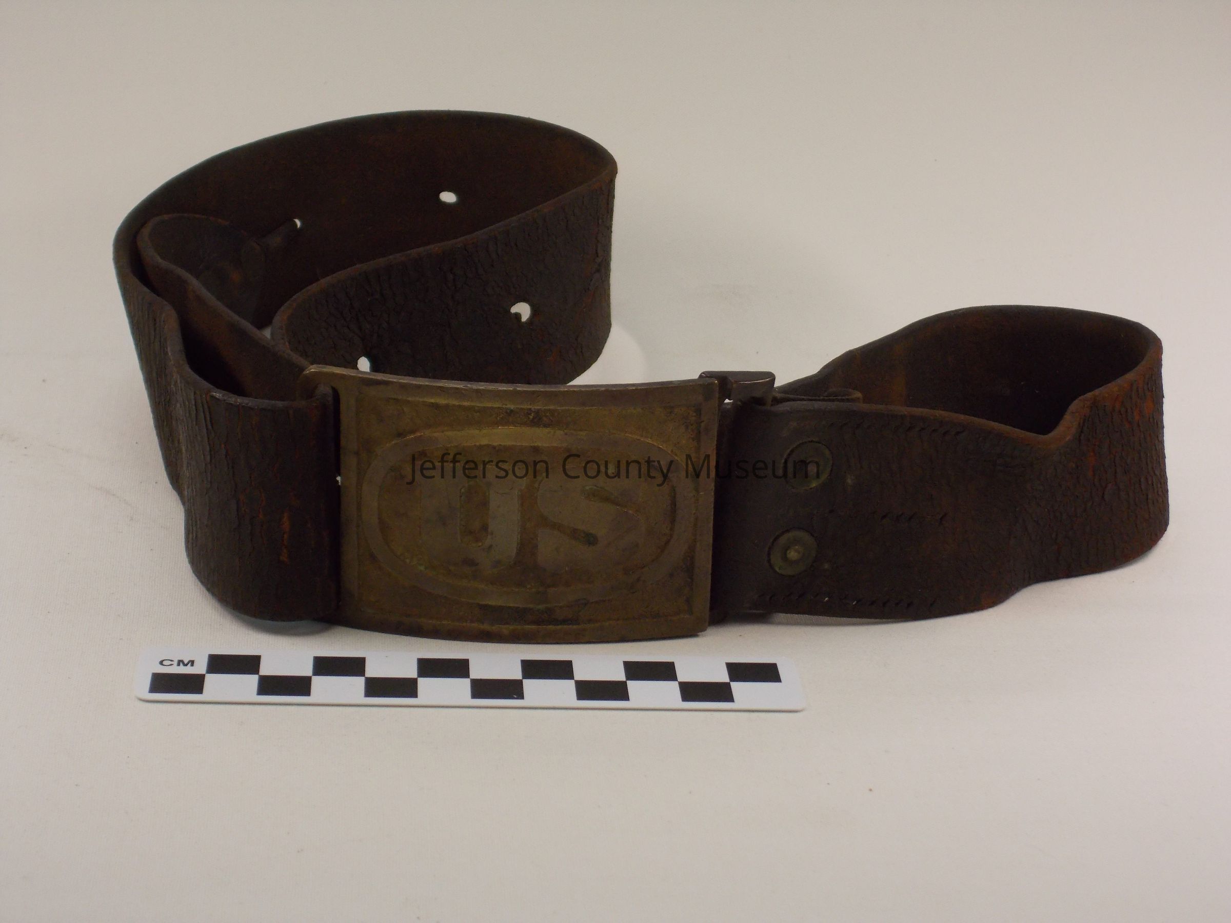 Wide leather belt with brass buckle and keeper. Buckle has "US" in an oval.Acquisition