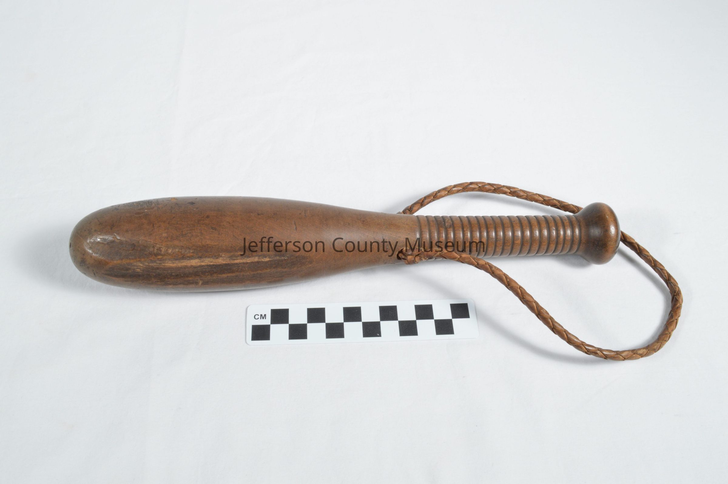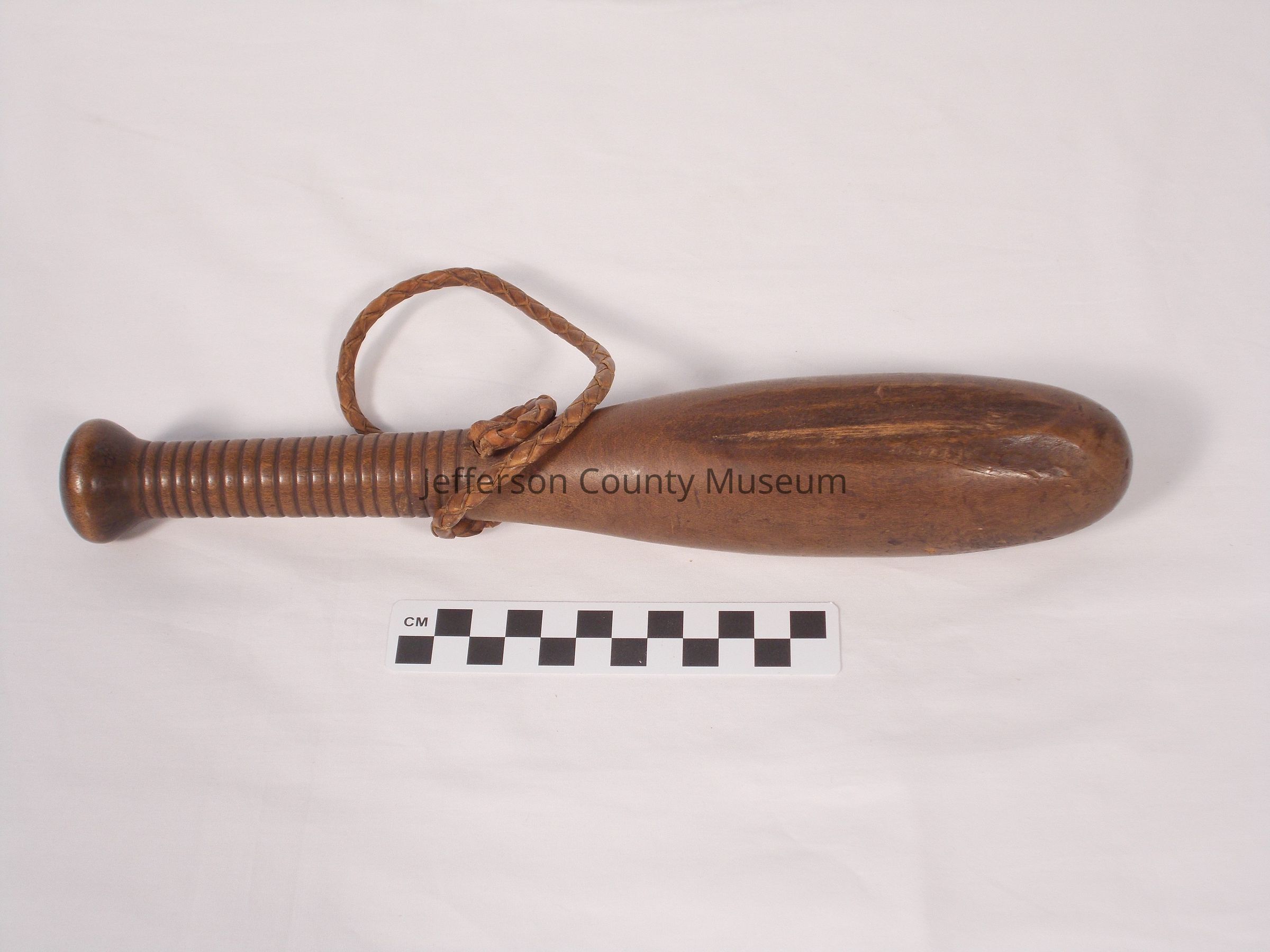 Wooden billy club, fatter on one end than the other. Braided leather lanyard attached at end of turned rings on the handle.Acquisition