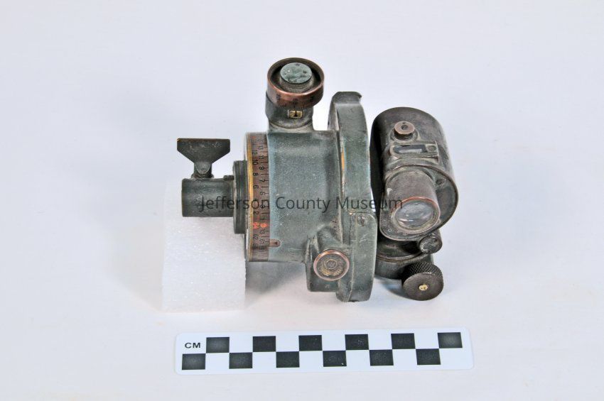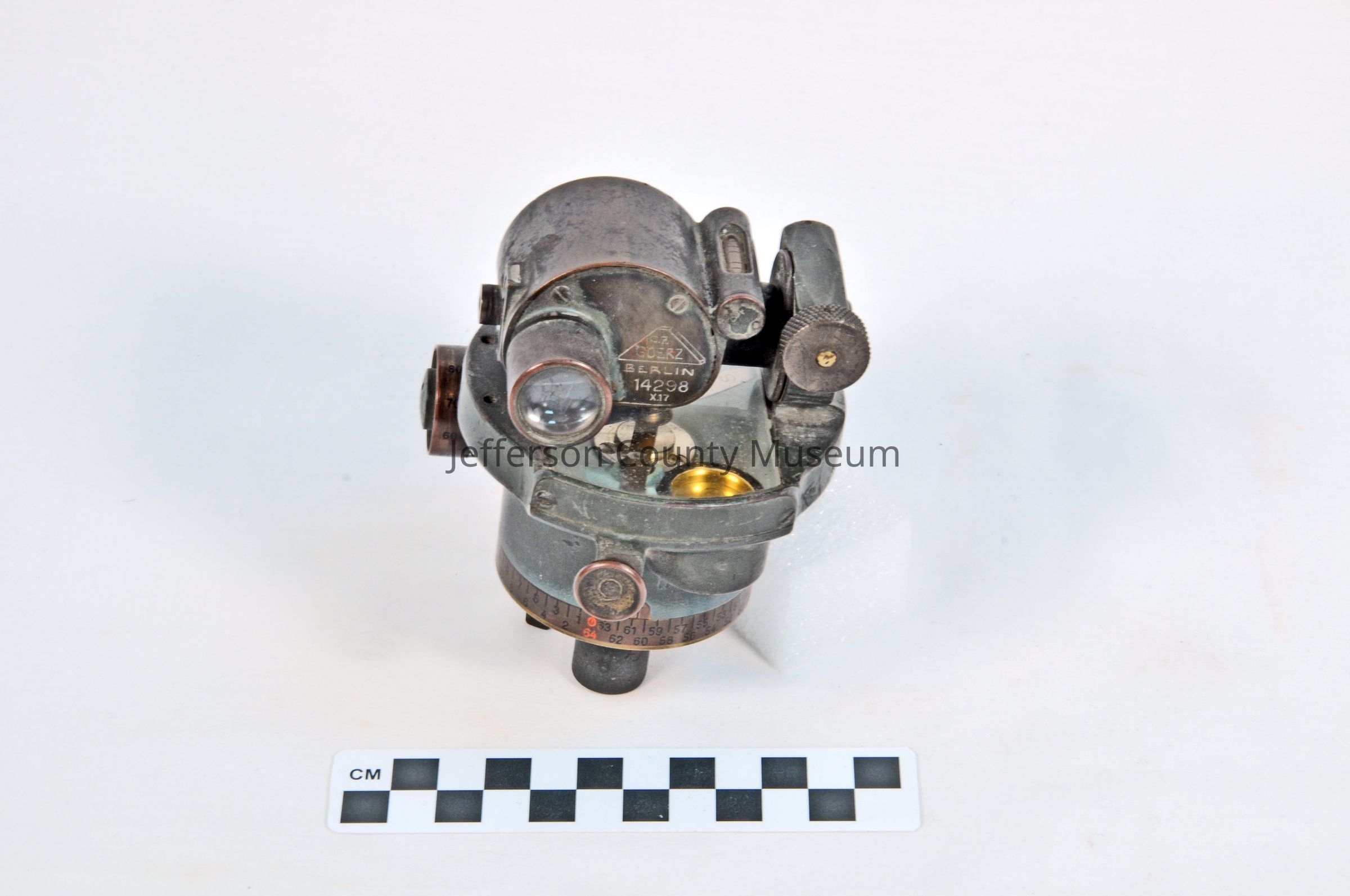 World War I artillery sight. There is a small viewing scope on top which can be lowered and raised with a knurled knob. There is also a knurled knob on the left rear of the piece and corresponding numbers on the right side probably for calculating distance. There is a number ring around the bottom of the piece. The entire mechanism can be mounted on a stand. There is a compass which is activated with a push-knob on the front. There are two bubbles for leveling the mechanism. In a triangle on the front of the viewing scope "C. P. GOERZ". Below that is "BERLIN 14298 X17". On the bottom of the piece is "11853".Acquisition