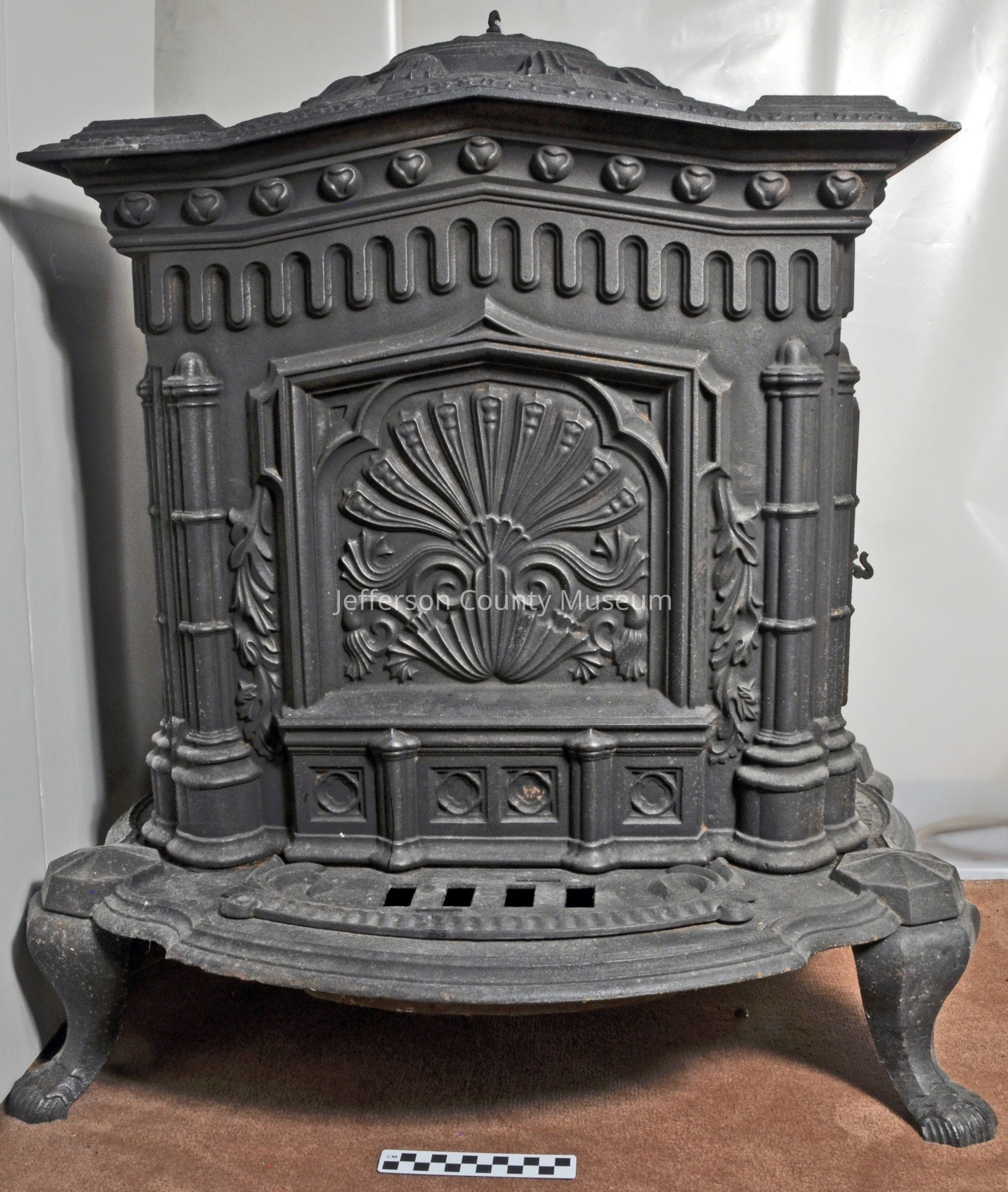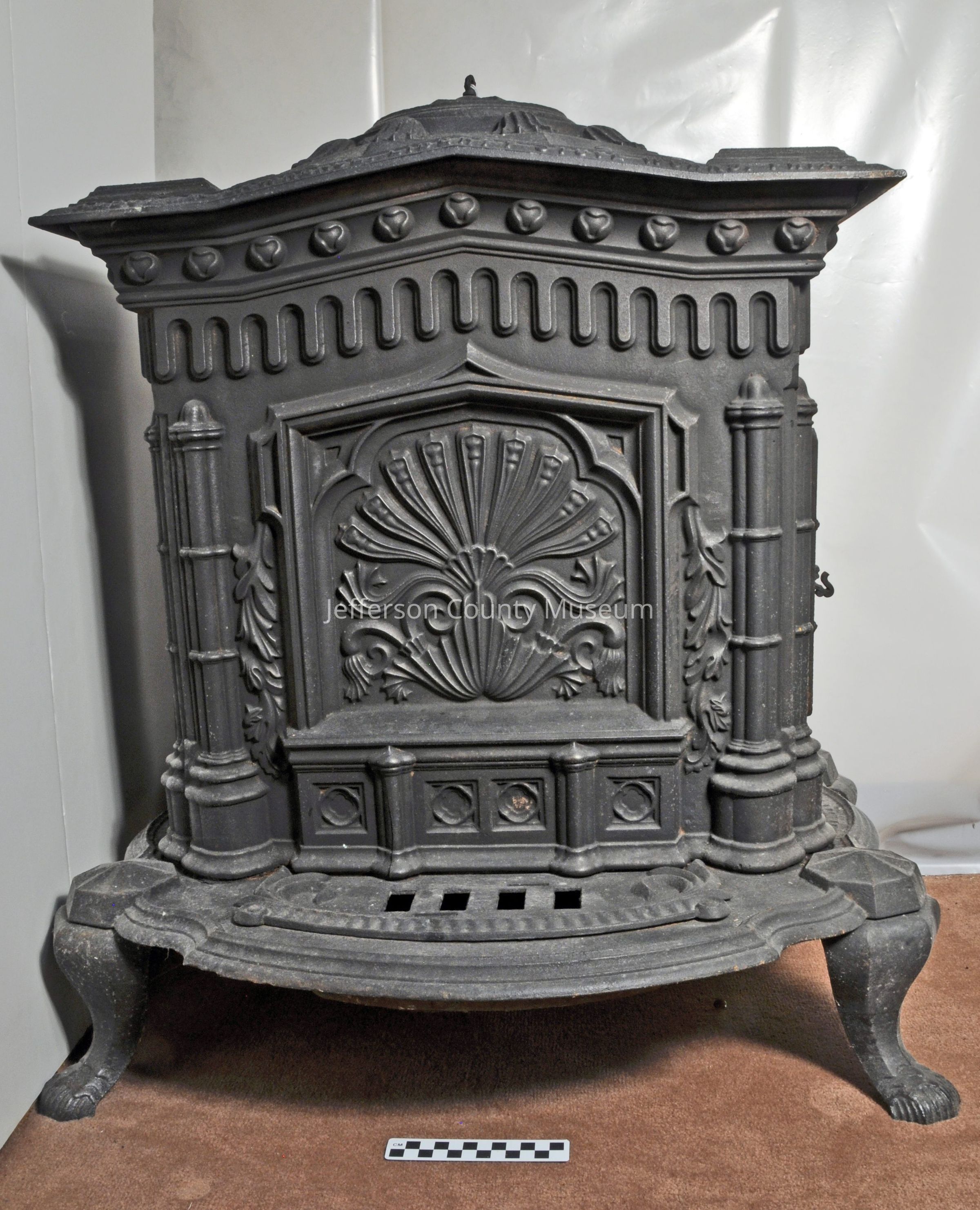 Rectangular, black, cast iron parlor stove. Fan shaped fancy work on front. Door on side. Round lid on top of stove comes off for heating water or cooking. Embossed on top front "ABBOTT & LAWRENCE. LIBERTY STOVE WORKS, PHIA".Acquisition