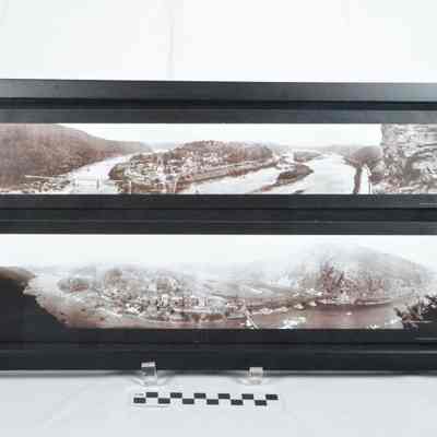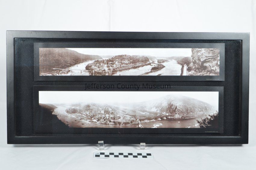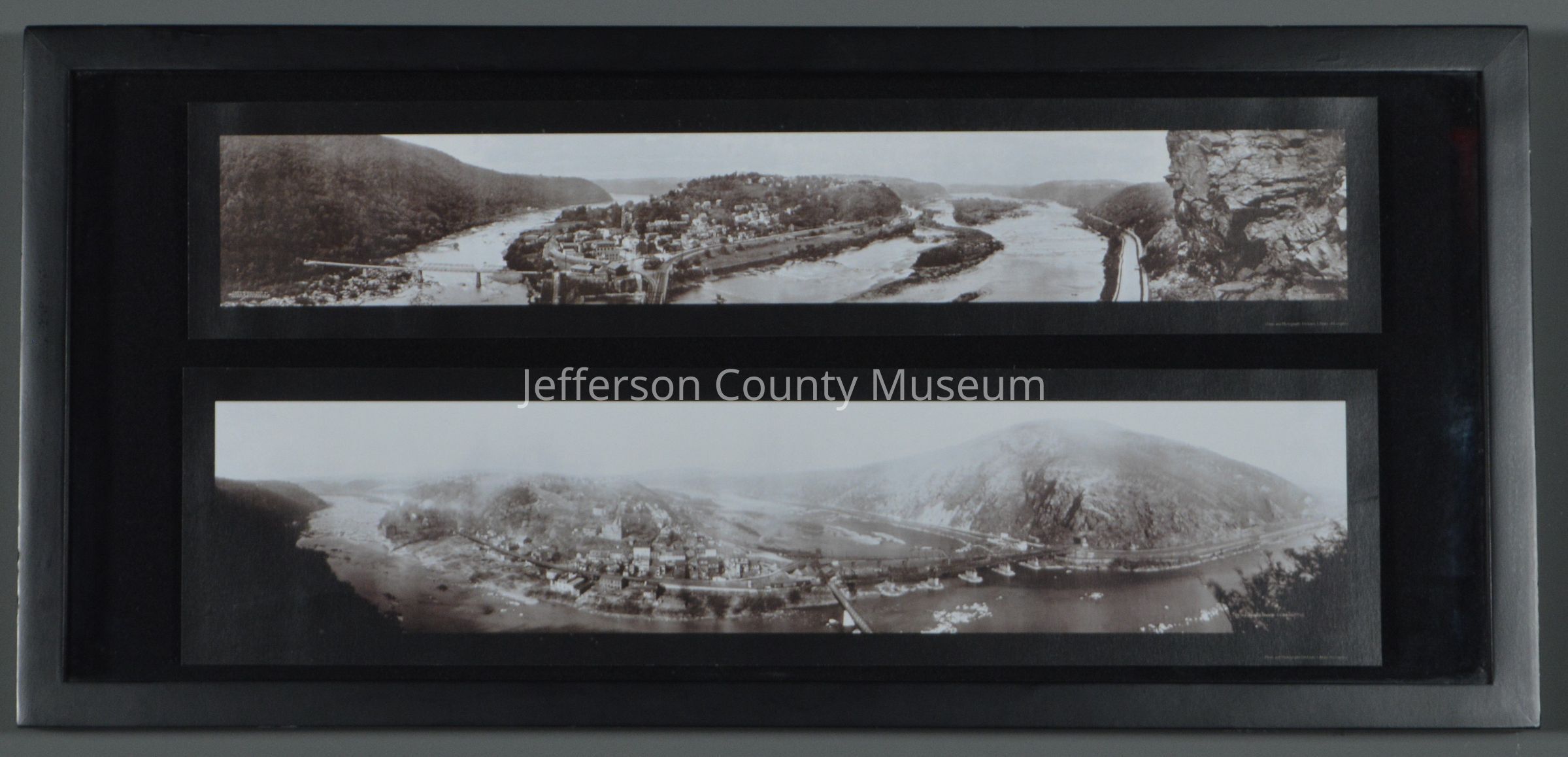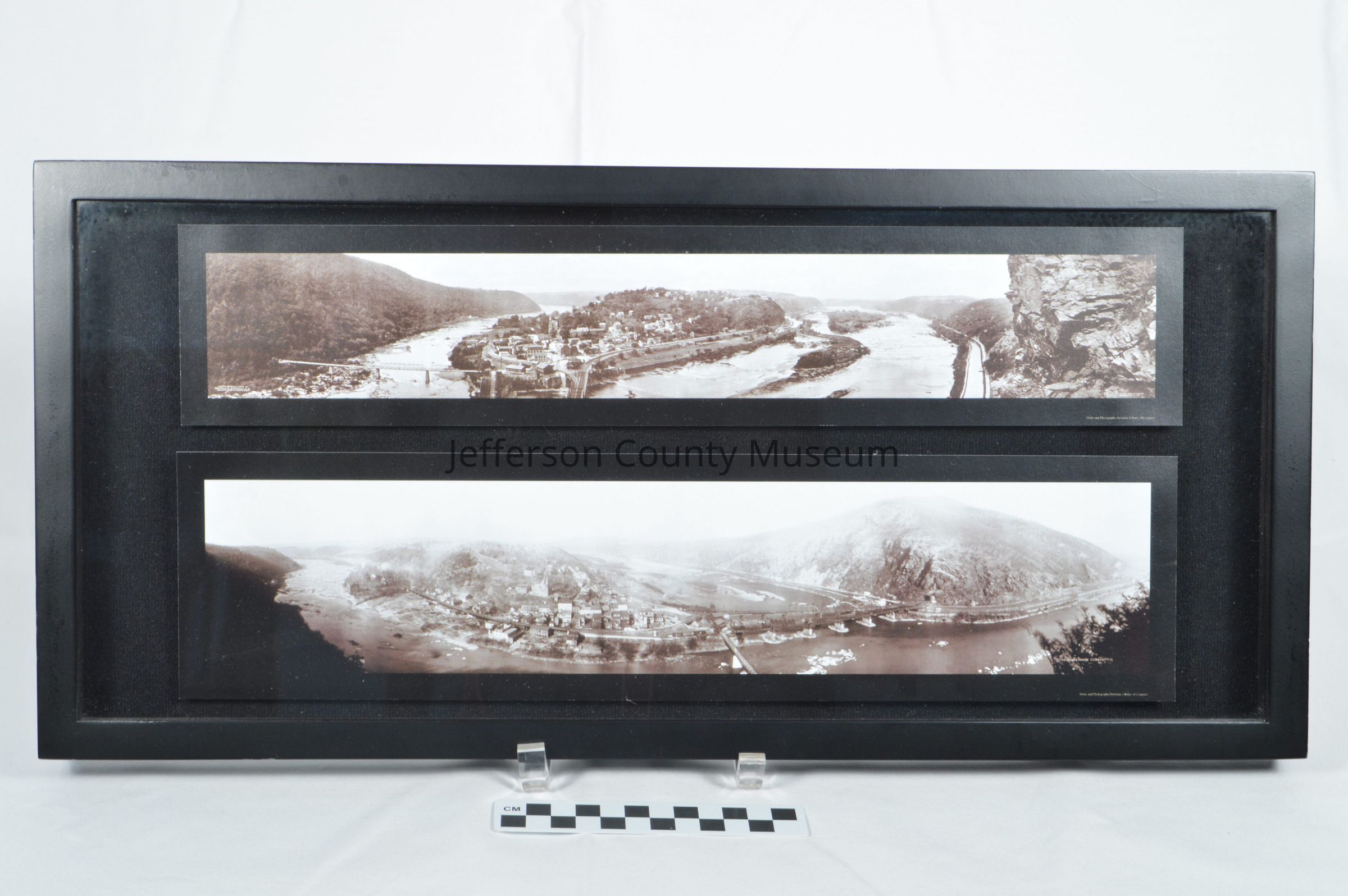 Two, black and white, panoramic photographs of Harpers Ferry, W.Va. Both images encased in the same black shadow box/frame.