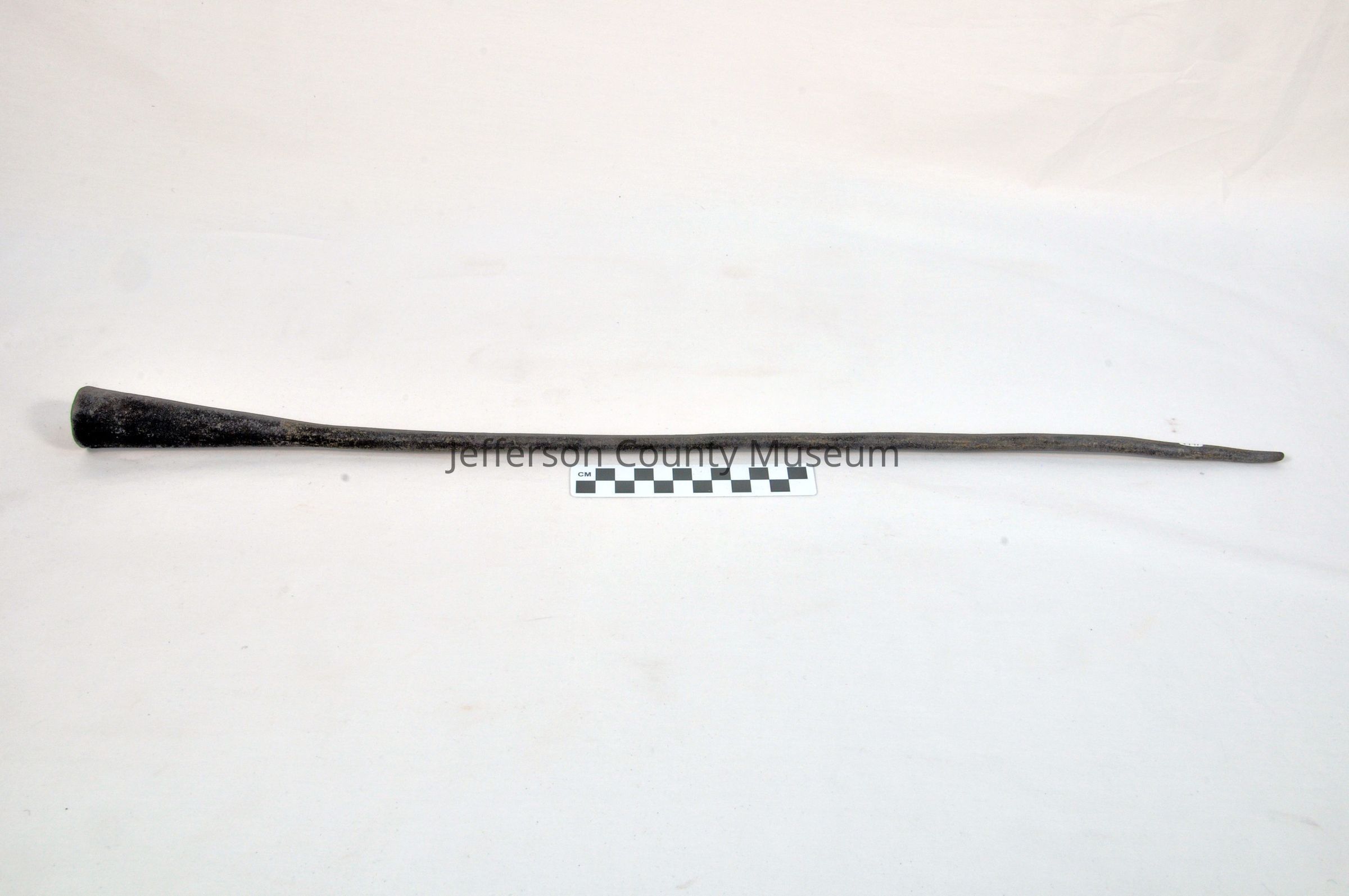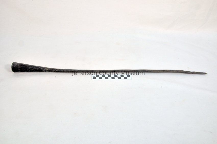 One piece iron fire poker. Handle is funnel shaped with a small hole at the top.