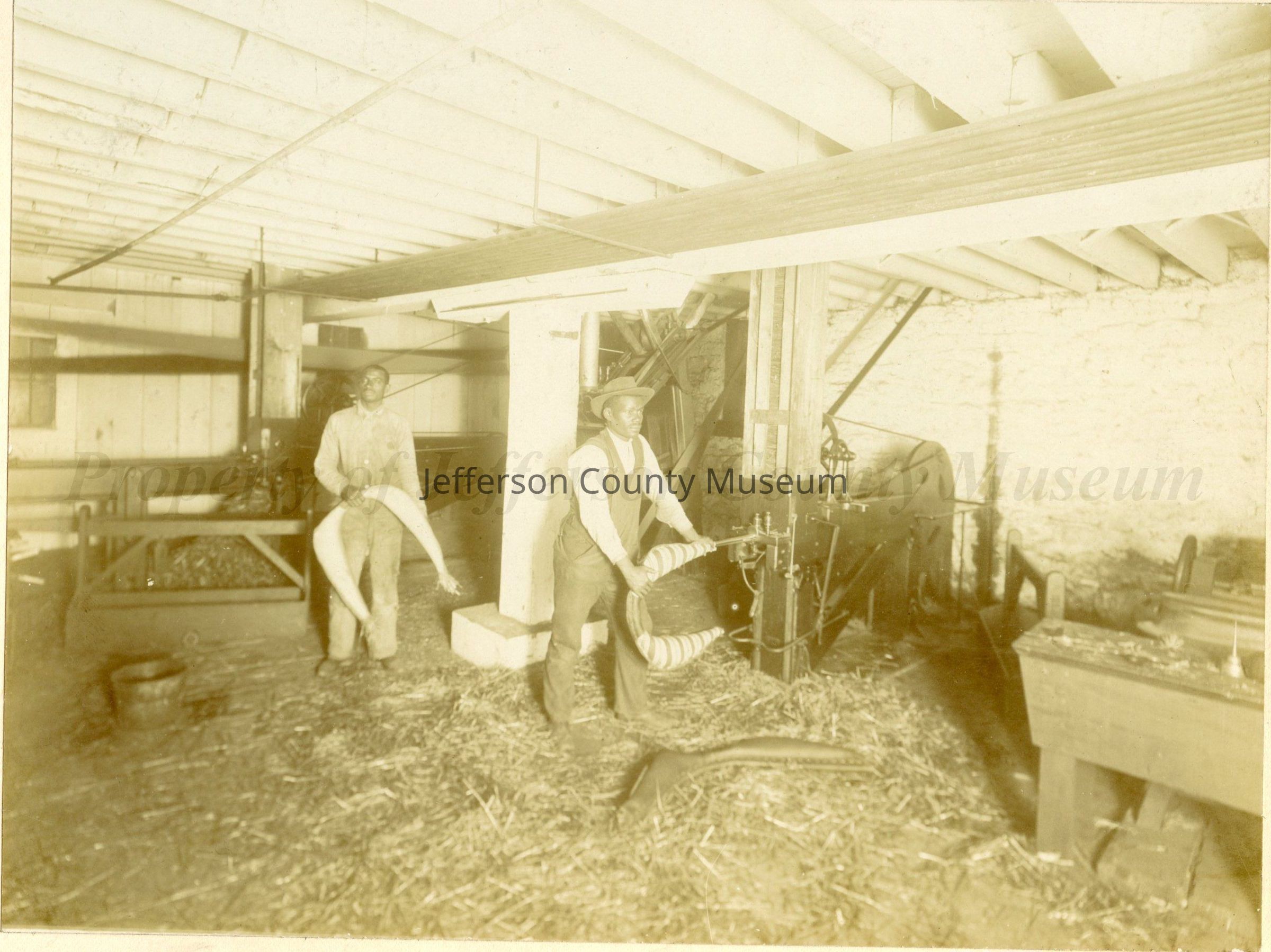 Workers inside the A. D. Goetz Harness Factory - two workers and machinery