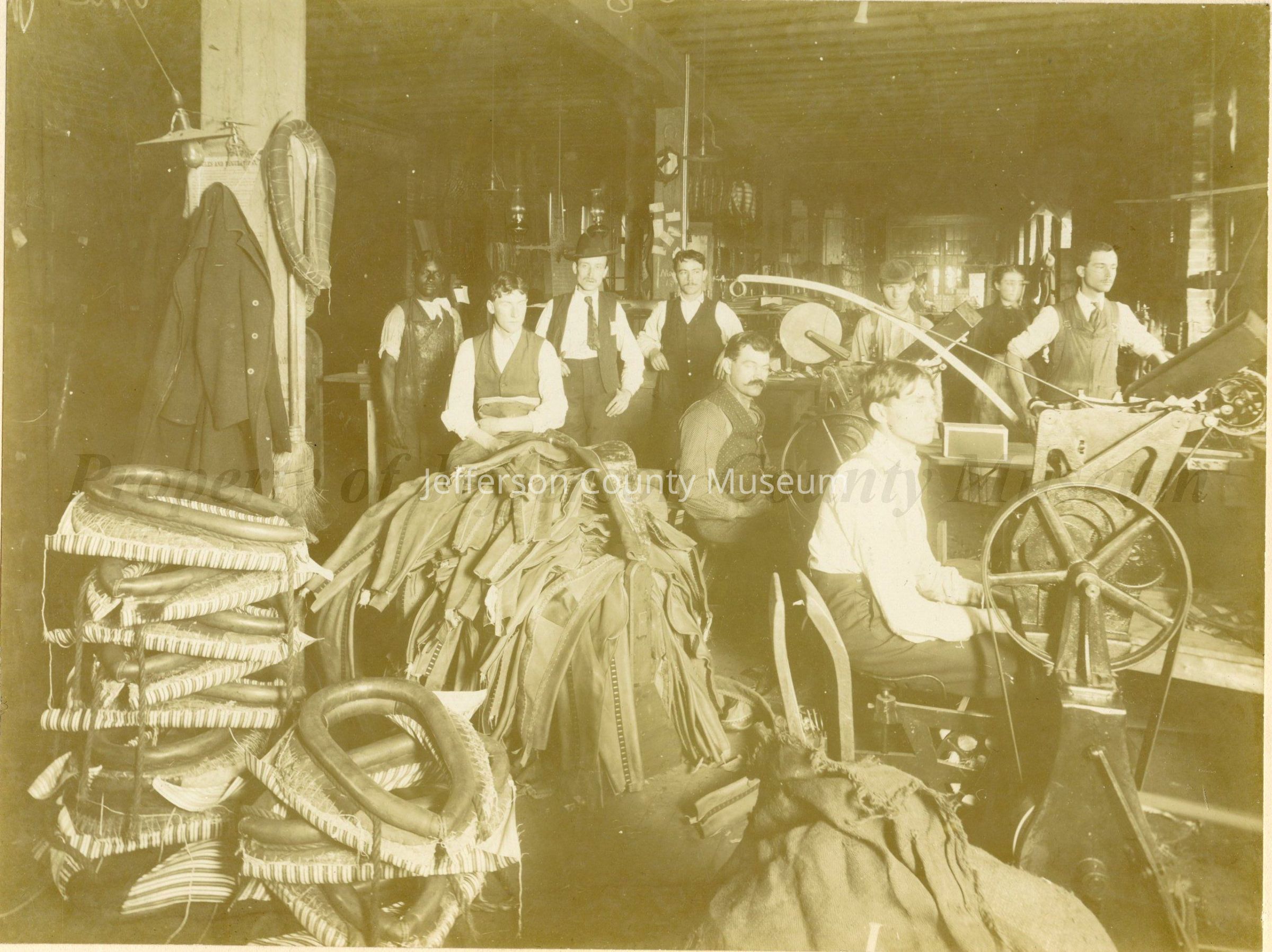 Nine workers inside the A. D. Goetz Harness Factory. Three copies of the photo included.