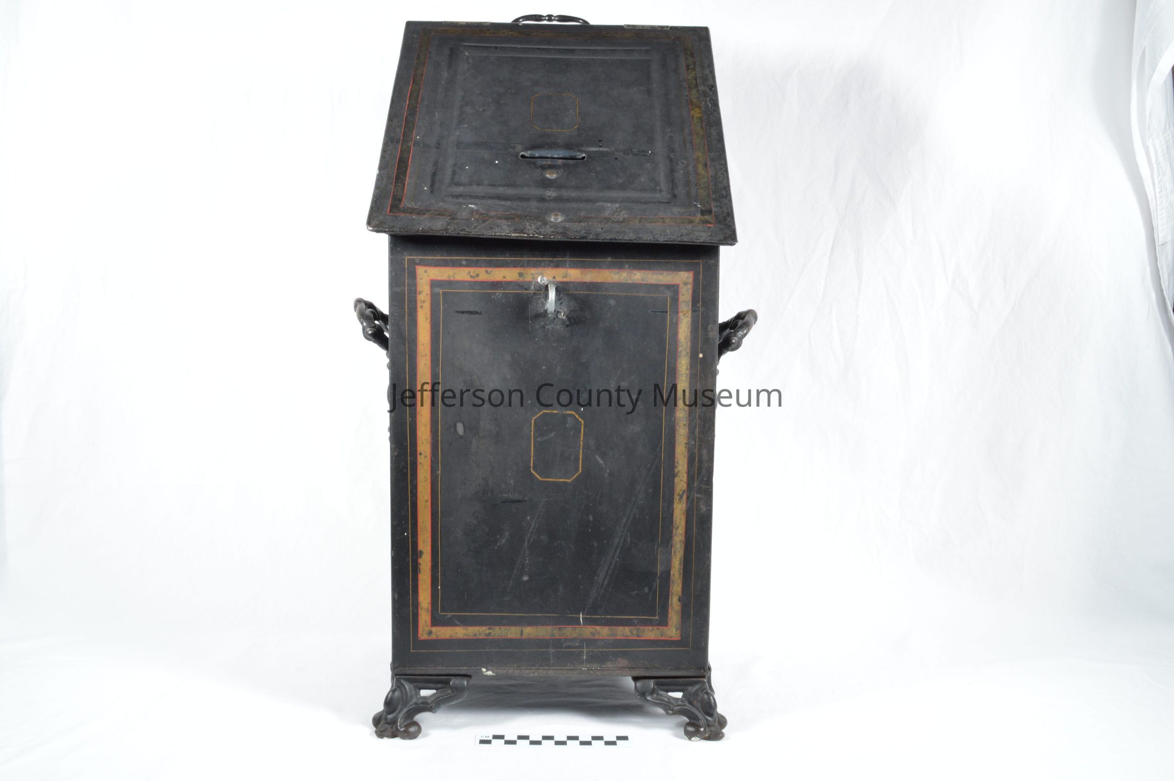 Tin storage box. Has slanted lid with a crude slot cut into the top. The lid has a lock hasp which was probably attached at a later date. Handle on back. Elaborate handles on sides. Decorated with gold and red striping.