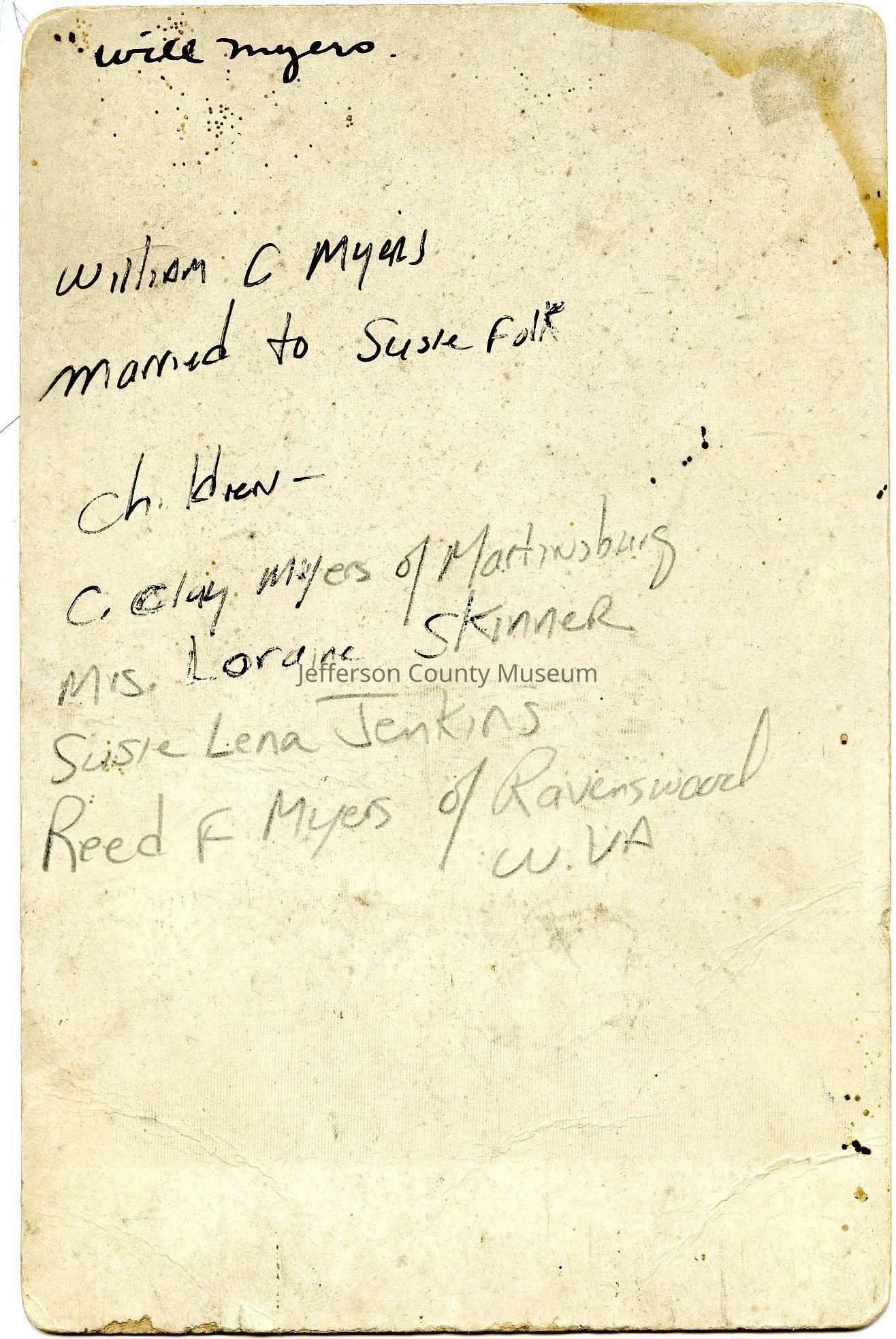 Portrait of William C. Myers. Married to Susie Folk, four children: C. Clay Myers of Martinsburg, Mrs. Loraine Skinner, Susie Lena Jenkins, and Reed F. Myers of Ravenswood, W. VA.Acquisition