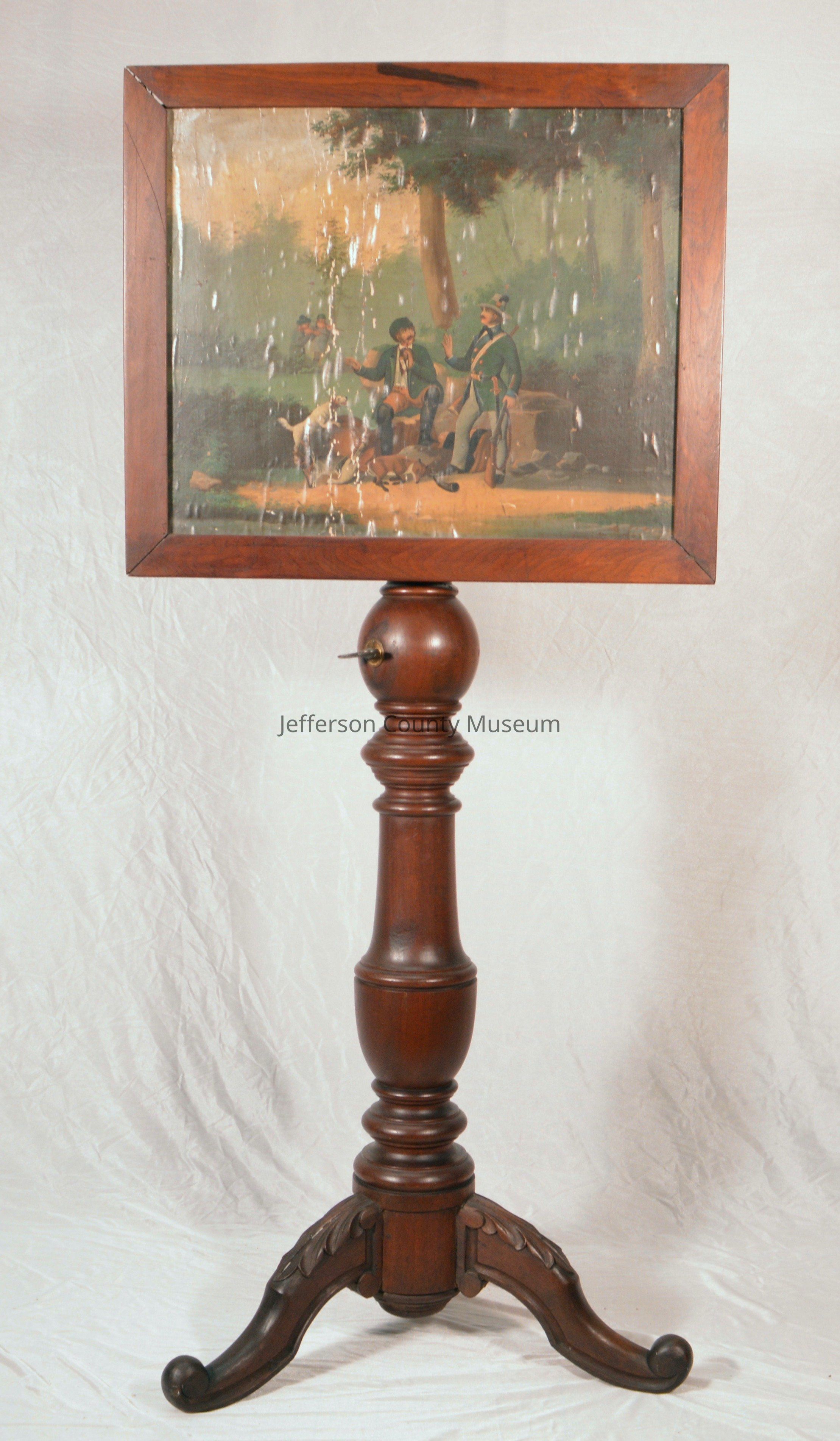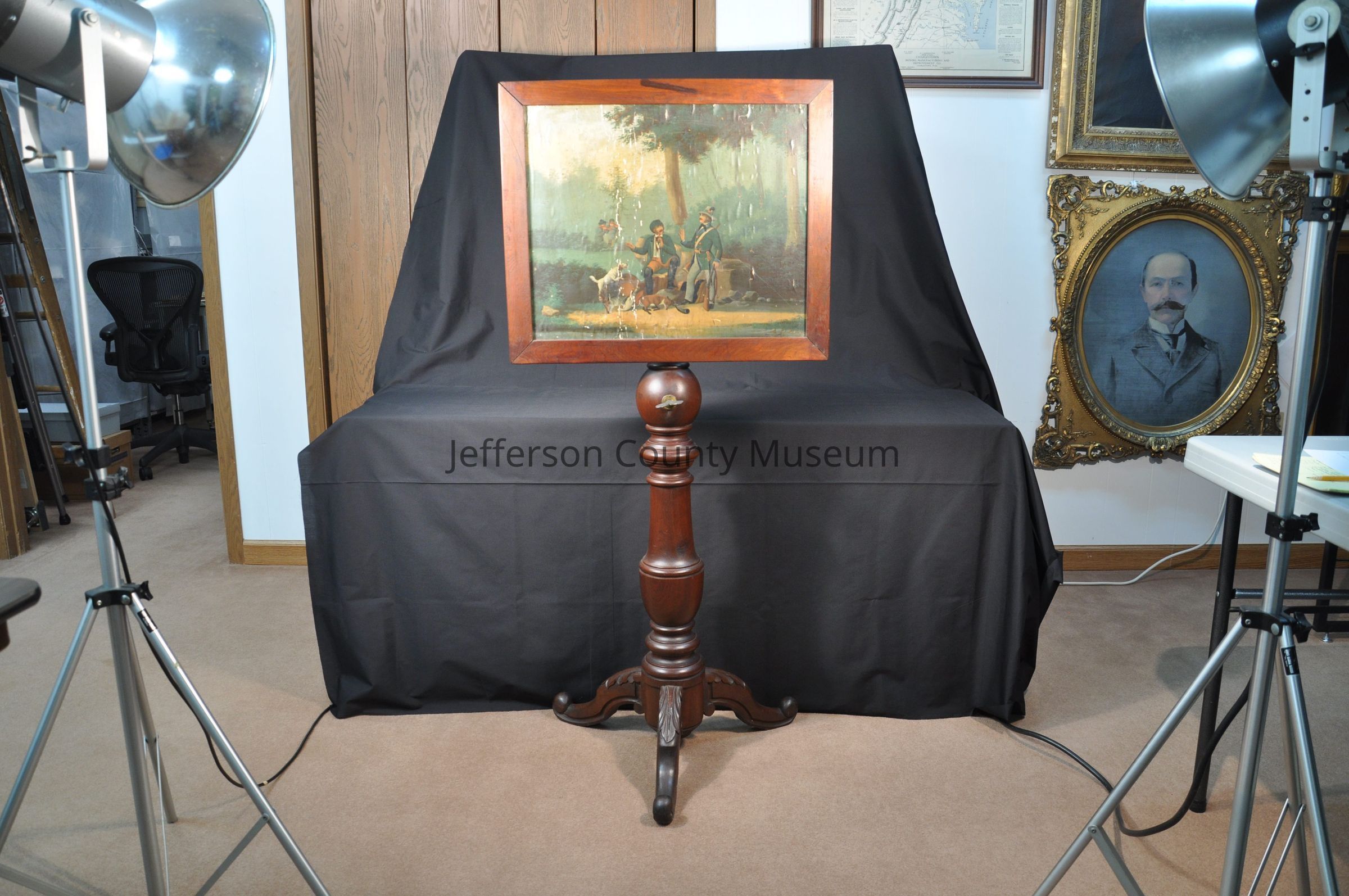 Victorian adjustable lectern with heavy turned mahogany pedestal. Three legs with leaf design. Top shows a hunting scene with two men in foreground talking, one standing, one seated smoking a pipe. Two men in background aiming their rifles.Acquisition
