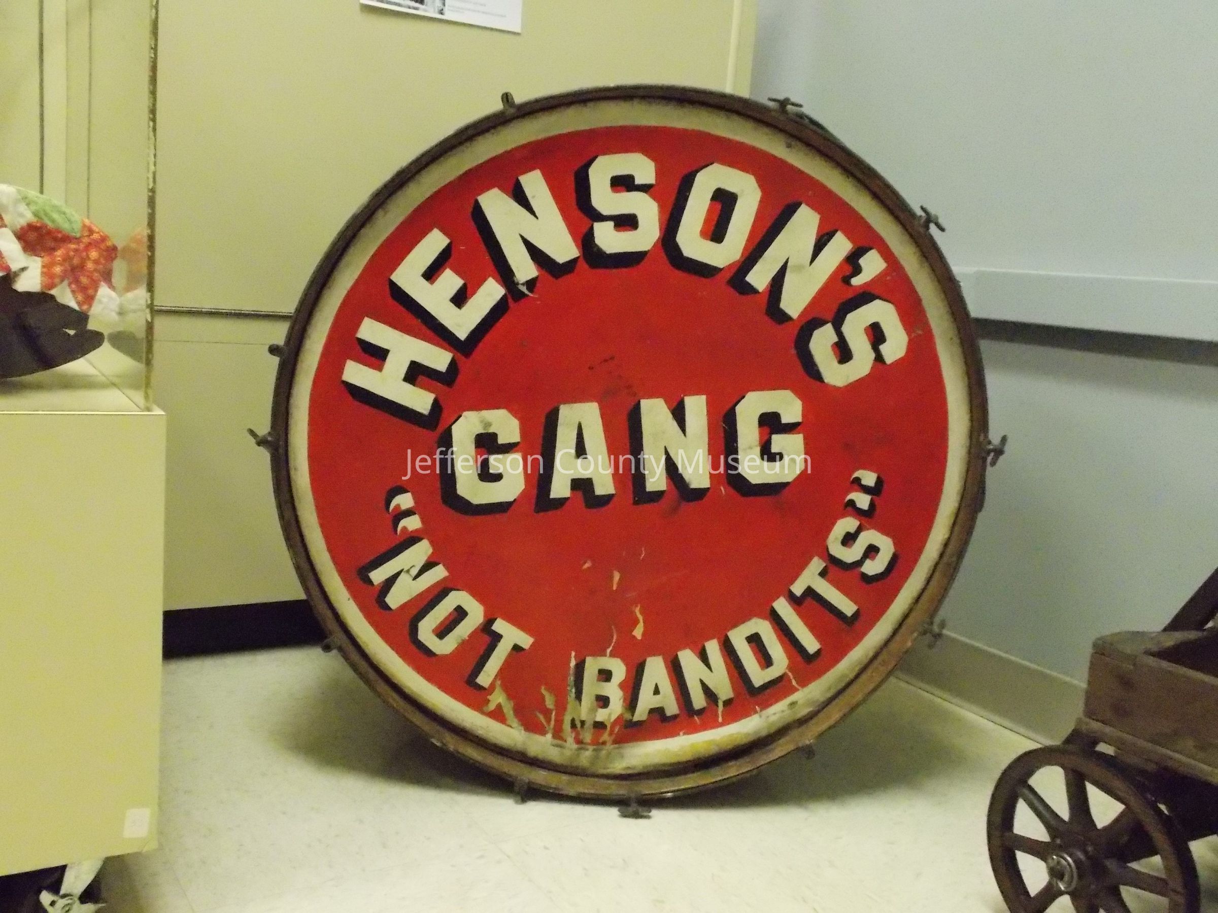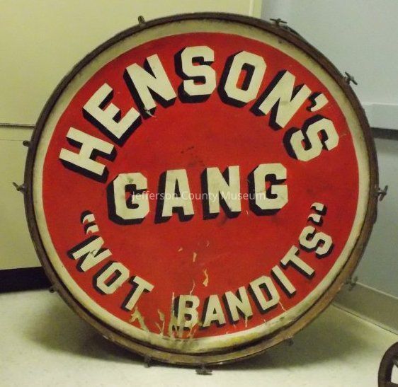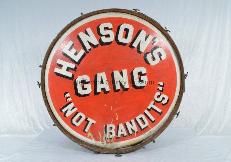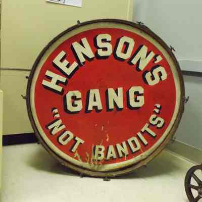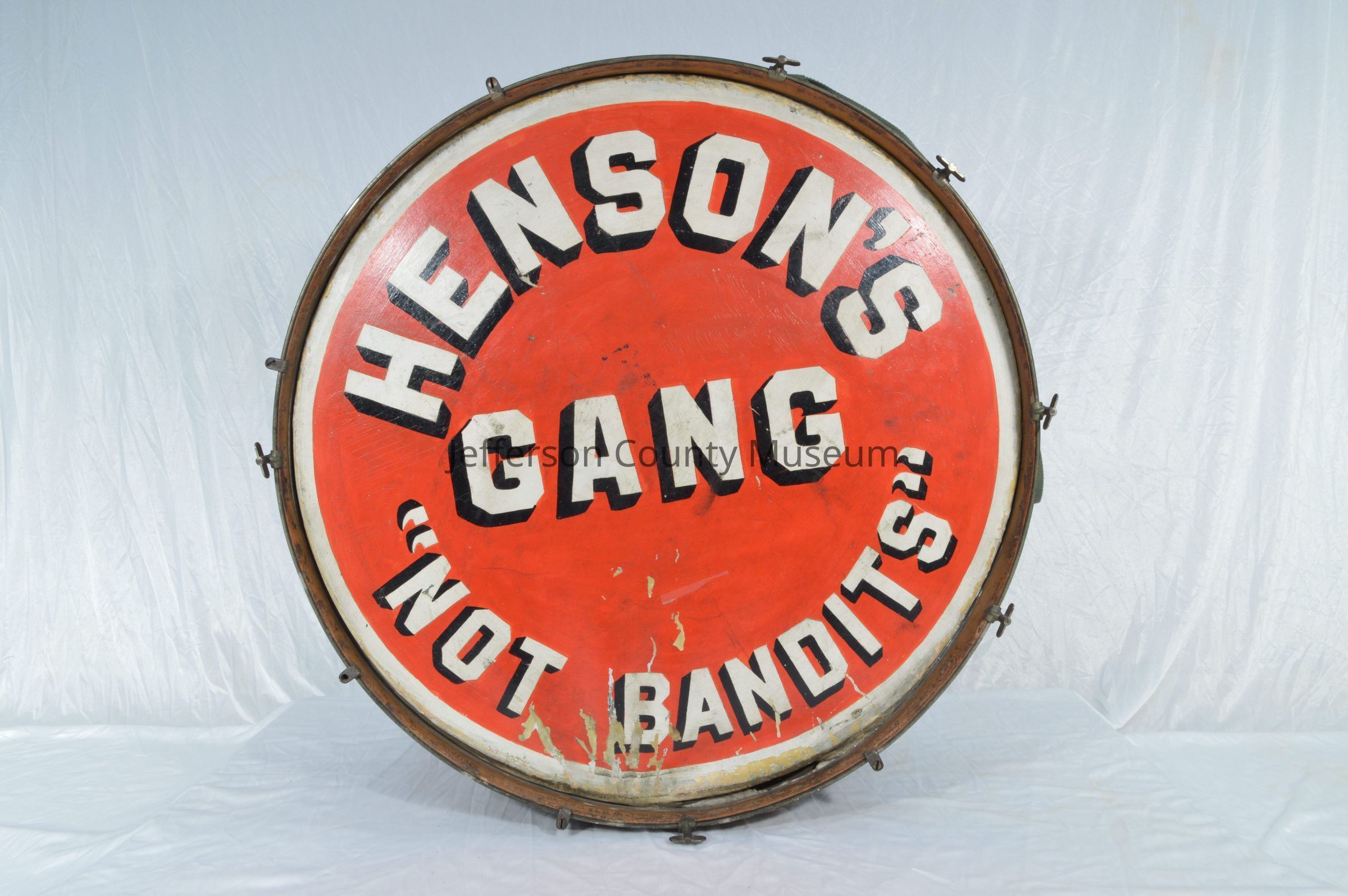 Bass drum, painted on one side in black and white letters on red background "HENSON'S GANG 'NOT BANDITS' ". Heavy green cloth strap for carrying.Acquisition