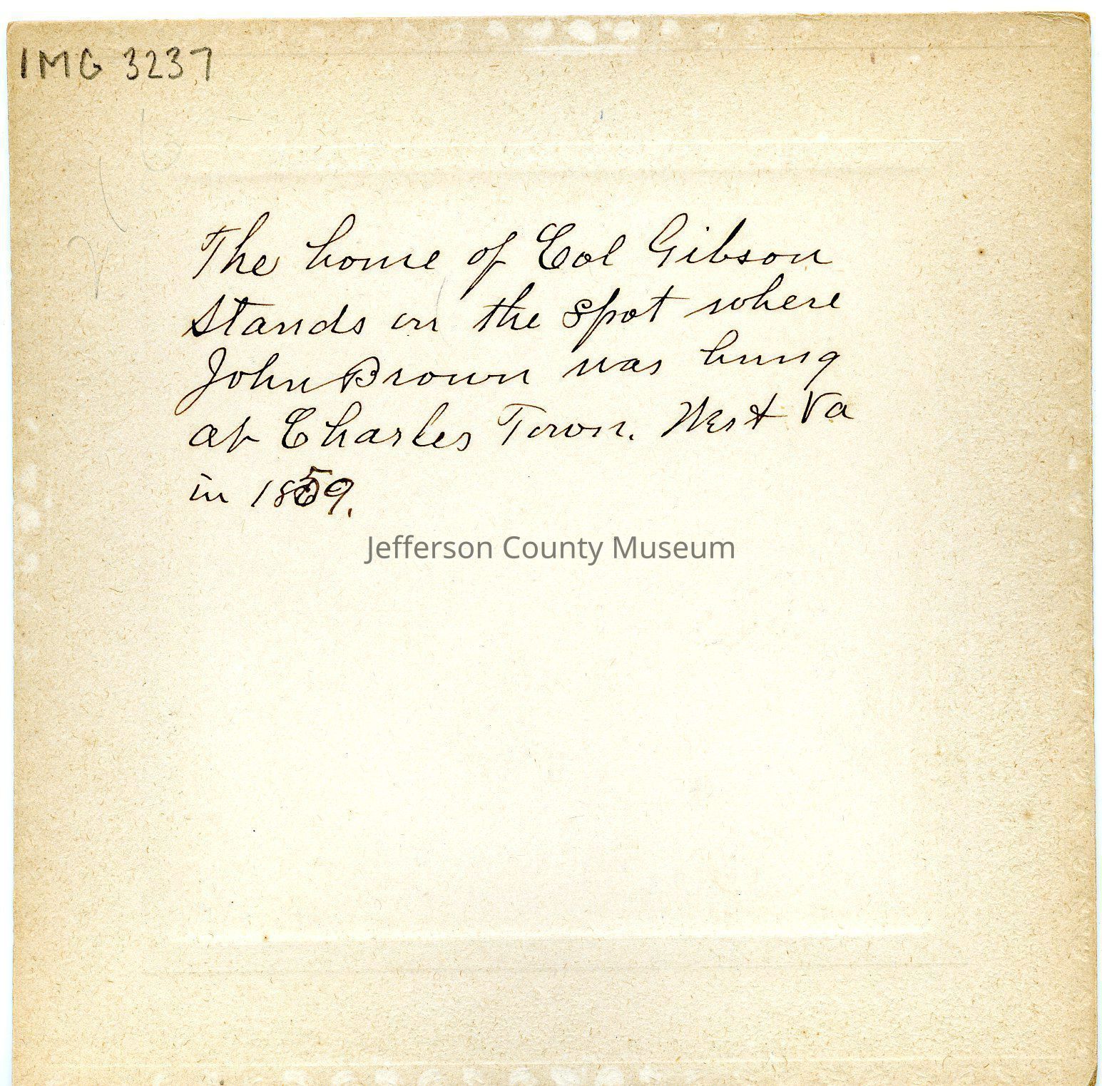 Hand-written inscription on the back reads, "The home of Col Gibson stands on the spot where John Brown was hung at Charles Town, West Va in 1859." Mounted on white matboard.Acquisition