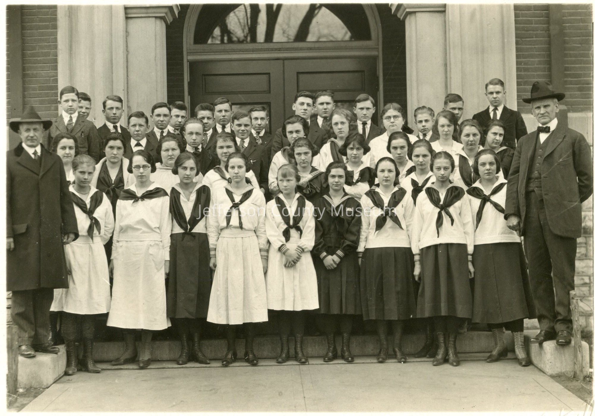 Photo shows school girls and boys standing in front of the old Charles Town High School. Girls are wearing black or white sailor blouses with black scarves.and black or white skirts. The boys are wearing suits and ties. Mr. Wright Denny is on right side wearing a suit and hat and another older man is on left wearing suit, overcoat and hat. Piece of blue dymo-tape with "1918" on it below photo. On back in pencil is "Marys first year of High School".Acquisition
