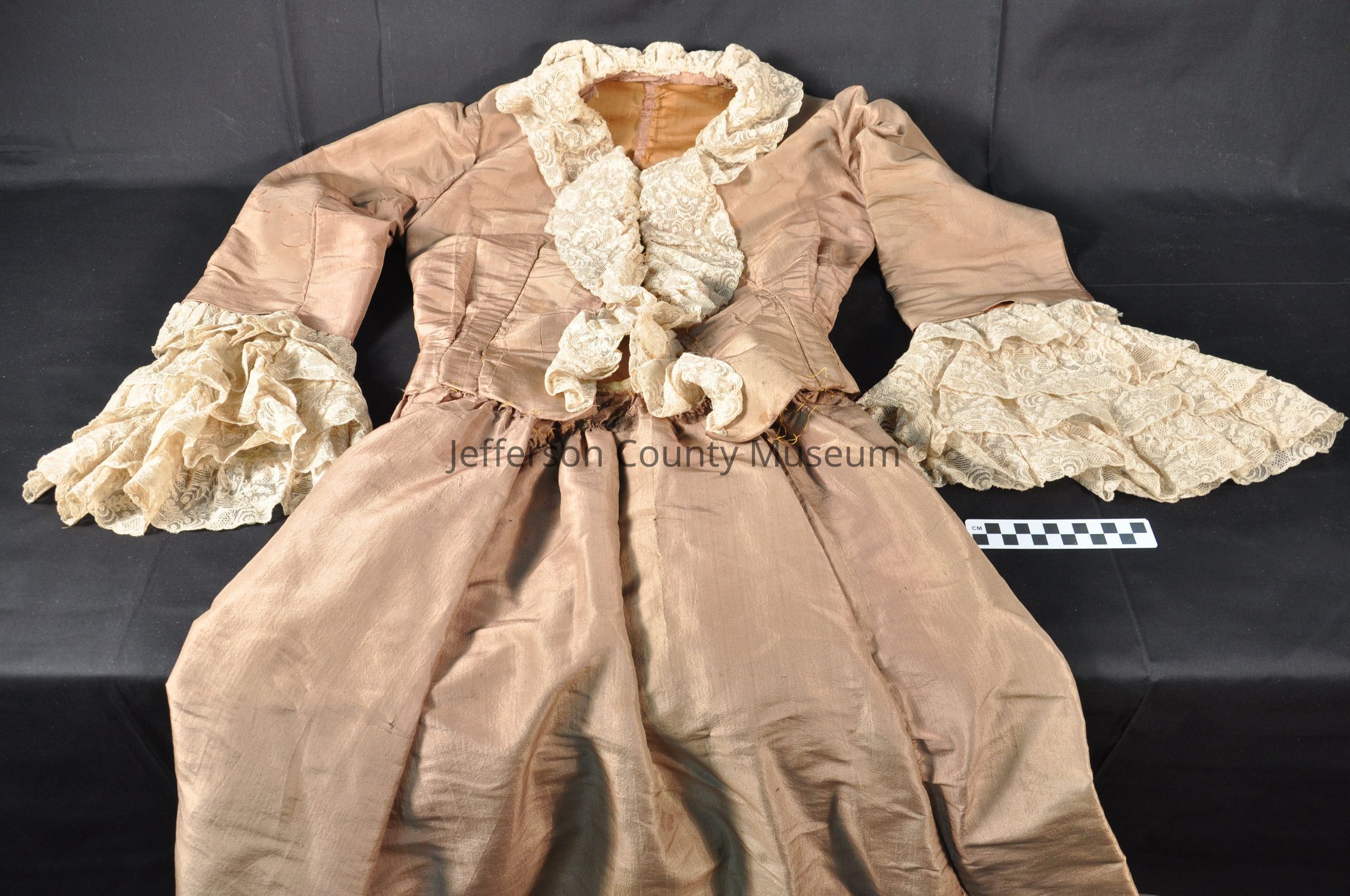 All handmade brown dress made of ashes of roses corded silk and lined. Skirt waist is smocked and separate from the bodice which has a front closure, a collar, an edging on the bodice closure and tiered cuffs of white lace. Cuffs were added to the original dress. The bodice shape has been altered, its skirt being made to point in the front and back.Context
