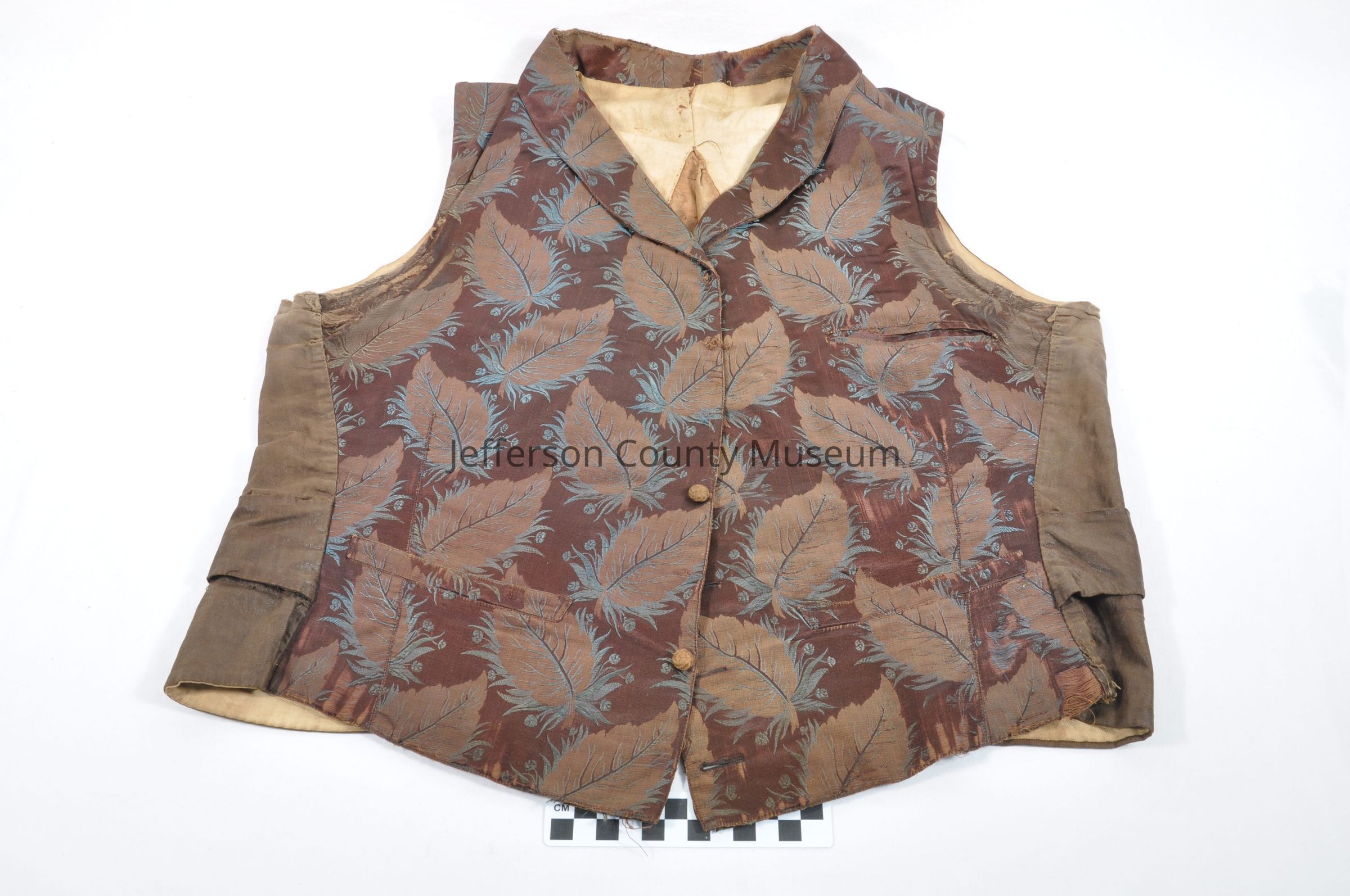 Dark brown lined vest with brocade leaf design on front with blue/green accents around leaves. Three pockets, two buttons.Acquisition