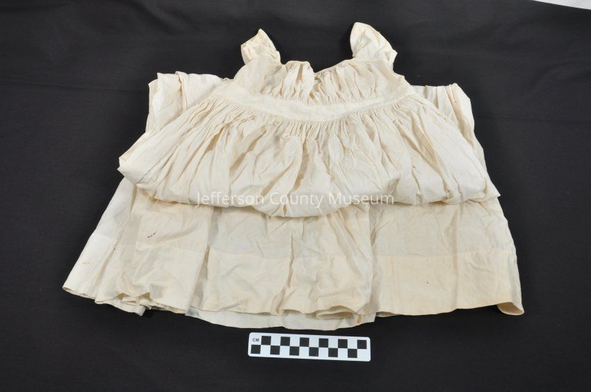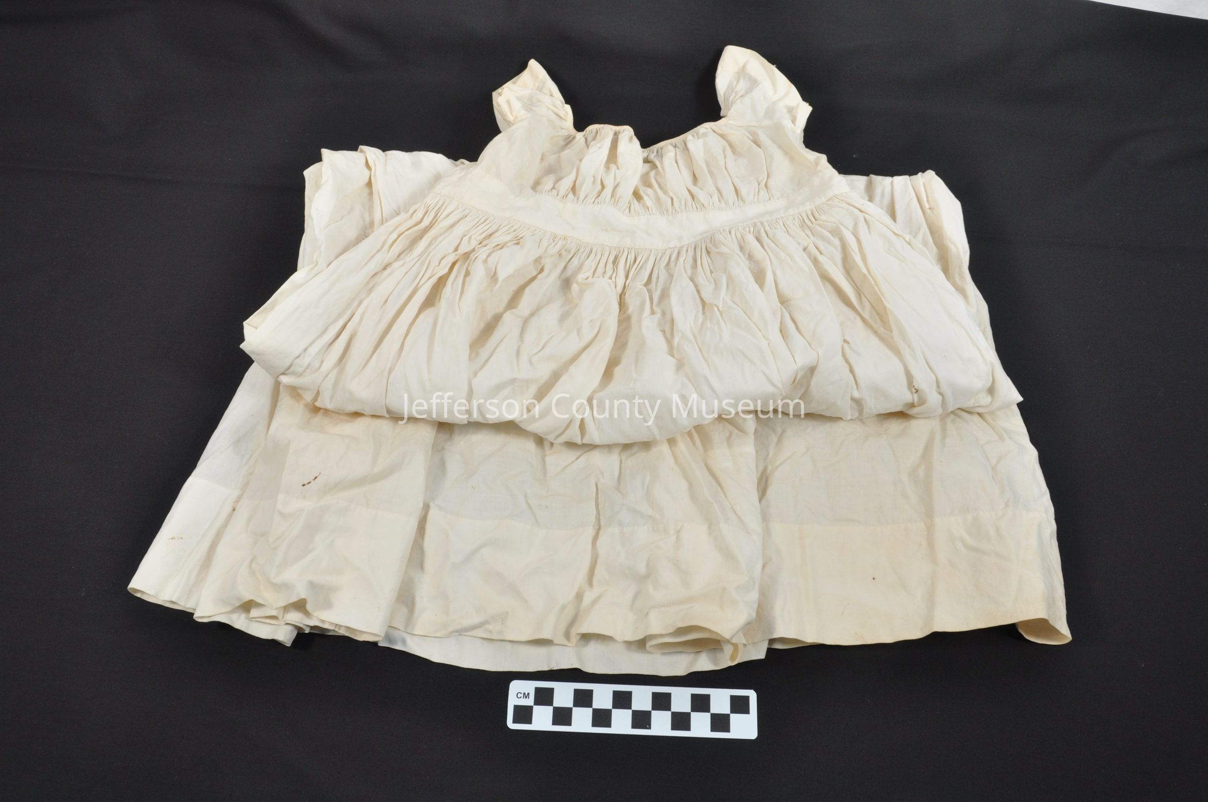 Off-white chemise for young girl with high gathered waist. Split down back to below waist. Two buttons and string ties at top.Acquisition