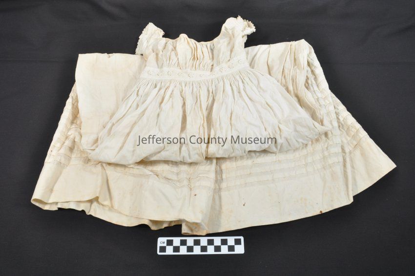 Off-white chemise for young girl. Embroidered design around waist and at end of short sleeves. Rows of pleats go around bottom. Split to waist in back. No buttons, button holes or ties.Acquisition