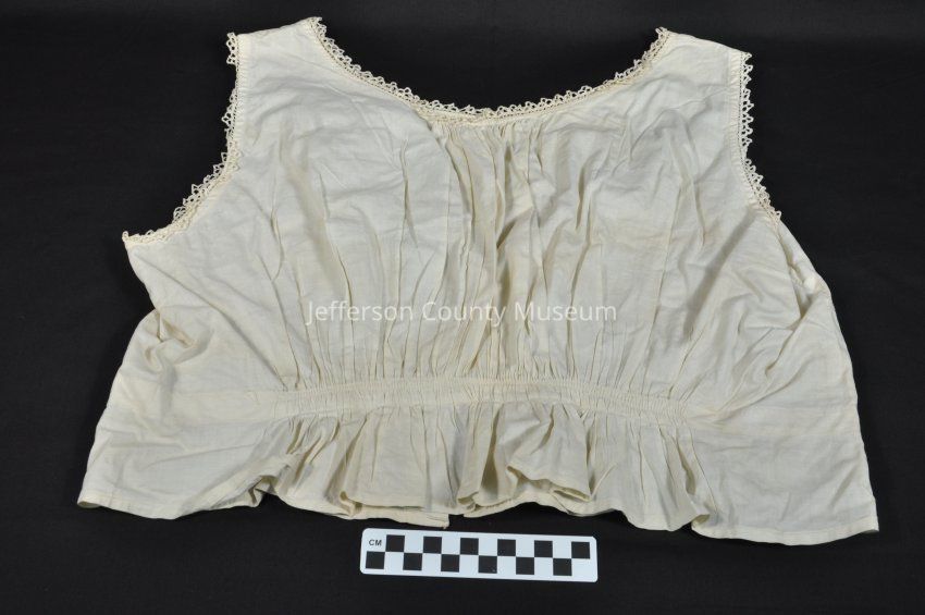 Off-white chemise top only. Crocheted decoration around arm holes and collar. Gathered at waist. Four buttons in backAcquisition