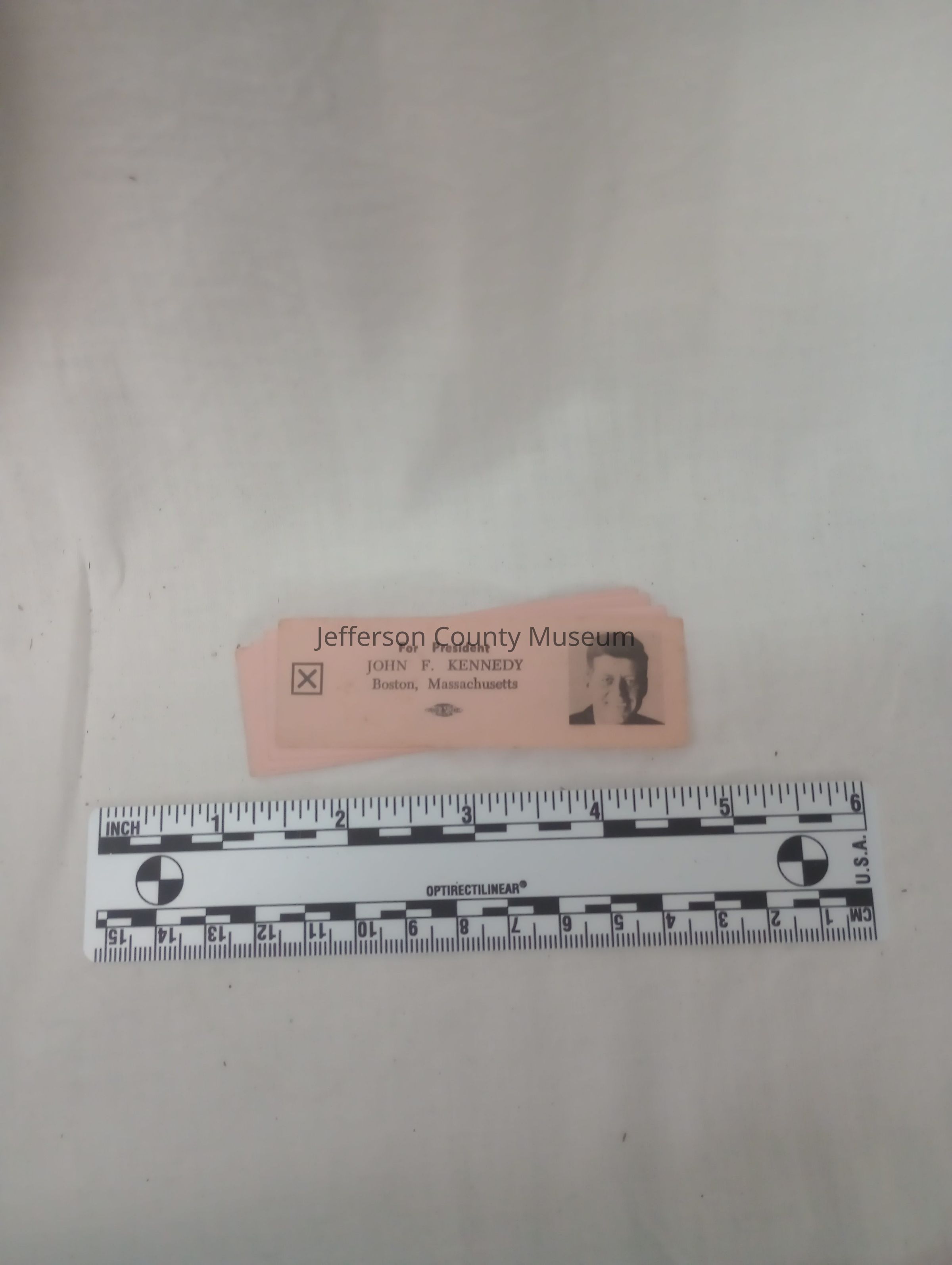 Set of six (6) pink picture cards promoting JFK for president. Each has a black x in a box and a photo of Kennedy with the text "For President / JOHN F. KENNEDY / Boston, Massachusetts".Context