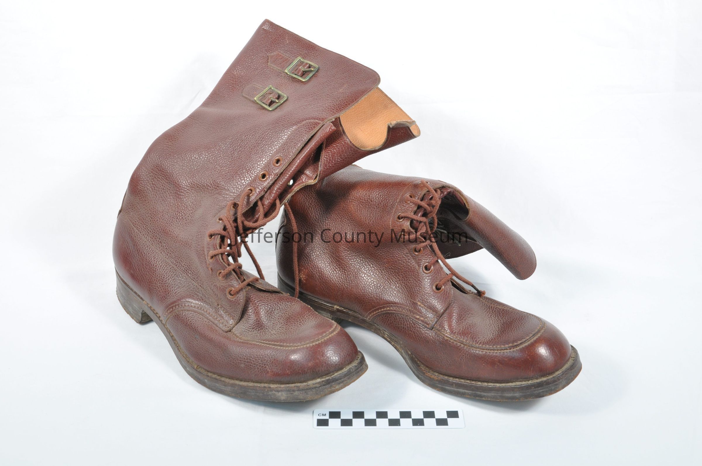 Brown World War II high-top leather boots. Pebble-grain leather & lace up. Top of each boot has a leather flap with two buckles. Inside the right boot is stamped in green "W" an arrow pointing up and "D 70". Below that in brown is "UPSONS LTD 1942 Size 11 Fitt M". Inside the left boot is stamped in black "W" an arrow pointing up and "D 111". Beside that is 'UPSONS LTD 1942 Size 11 Fitt M". Right shoe labeled as "A" and left shoe labeled as "B".Acquisition