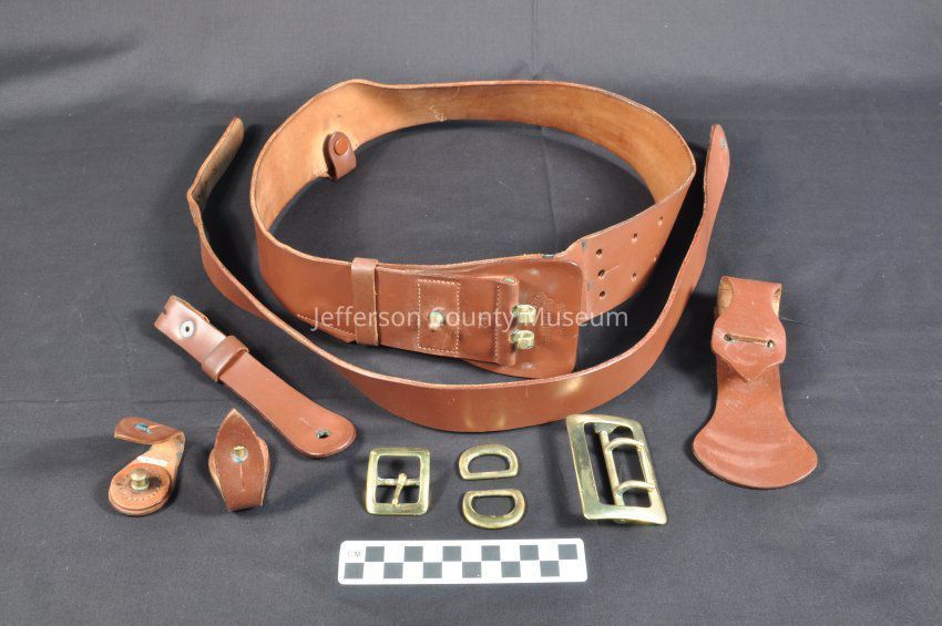 Brown leather belt with heavy brass buckle, D rings, shoulder strap and sword hanger. Stamped on waist belt near buckle "GENUINE SERVICE SHELL CORDOVAN 32". Worn by overseas U.S. soldiers in World War I.Acquisition