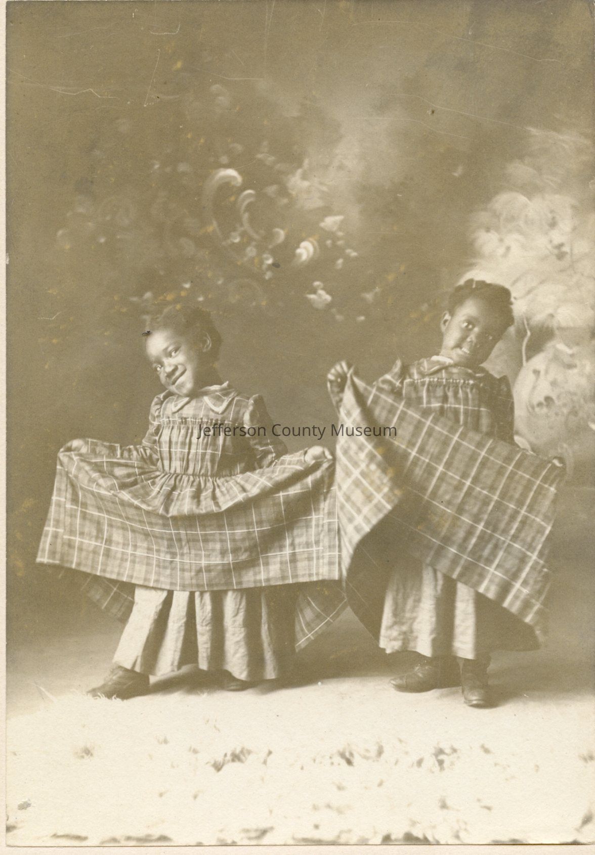 Margaret and Louise twin African American girls, March 1900, in plaid dresses. Written on reverse "The -- to Mrs. Aglionby with kingest regards, CM Dodge, March 1900".Acquisition