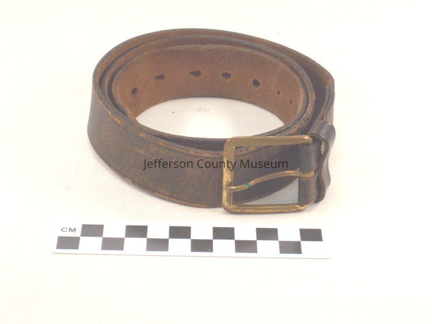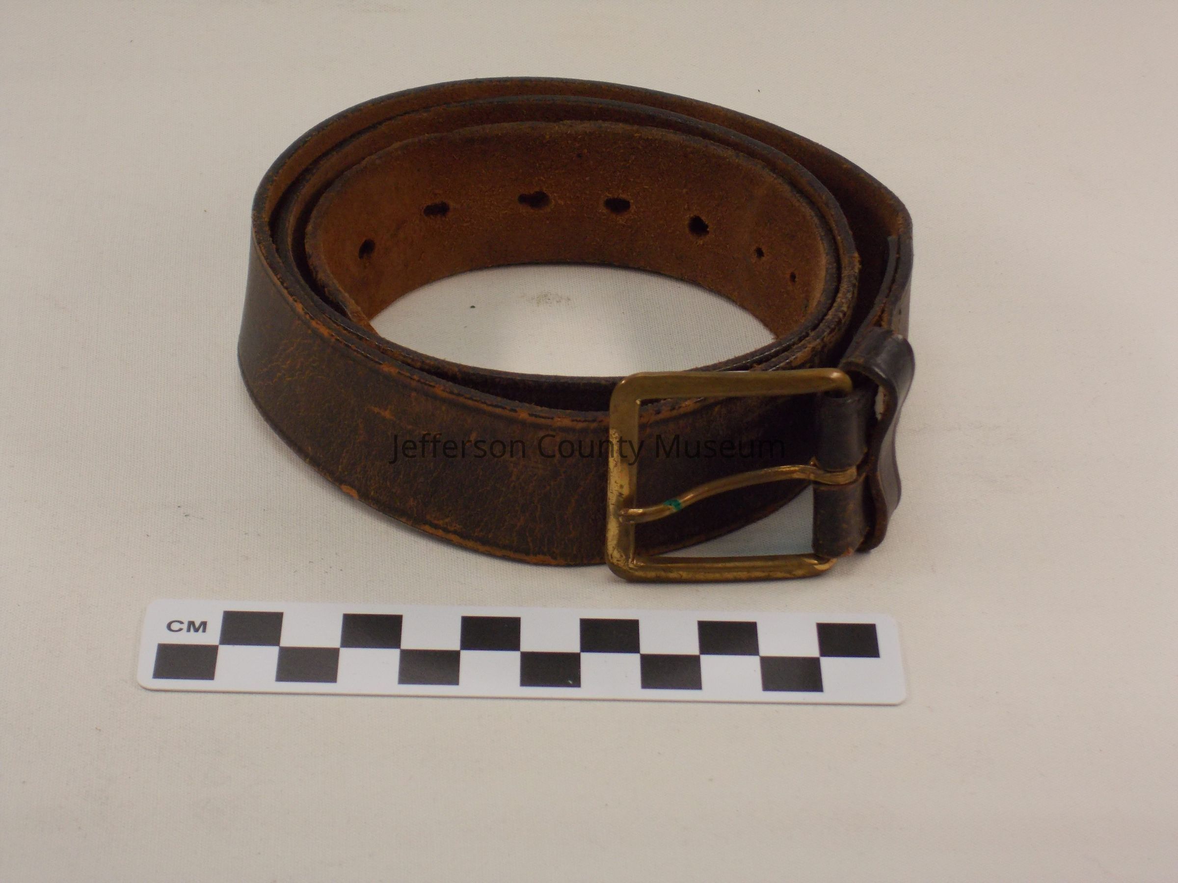 Leather belt with brass buckle, probably World War II (WWII). Extra holes have been punched into belt. On the inside of the belt near buckle is "5701 T PIONEER SADDLE LEATHER". Closer to buckle is "38". On inside of buckle "SOLID BRASS".Acquisition