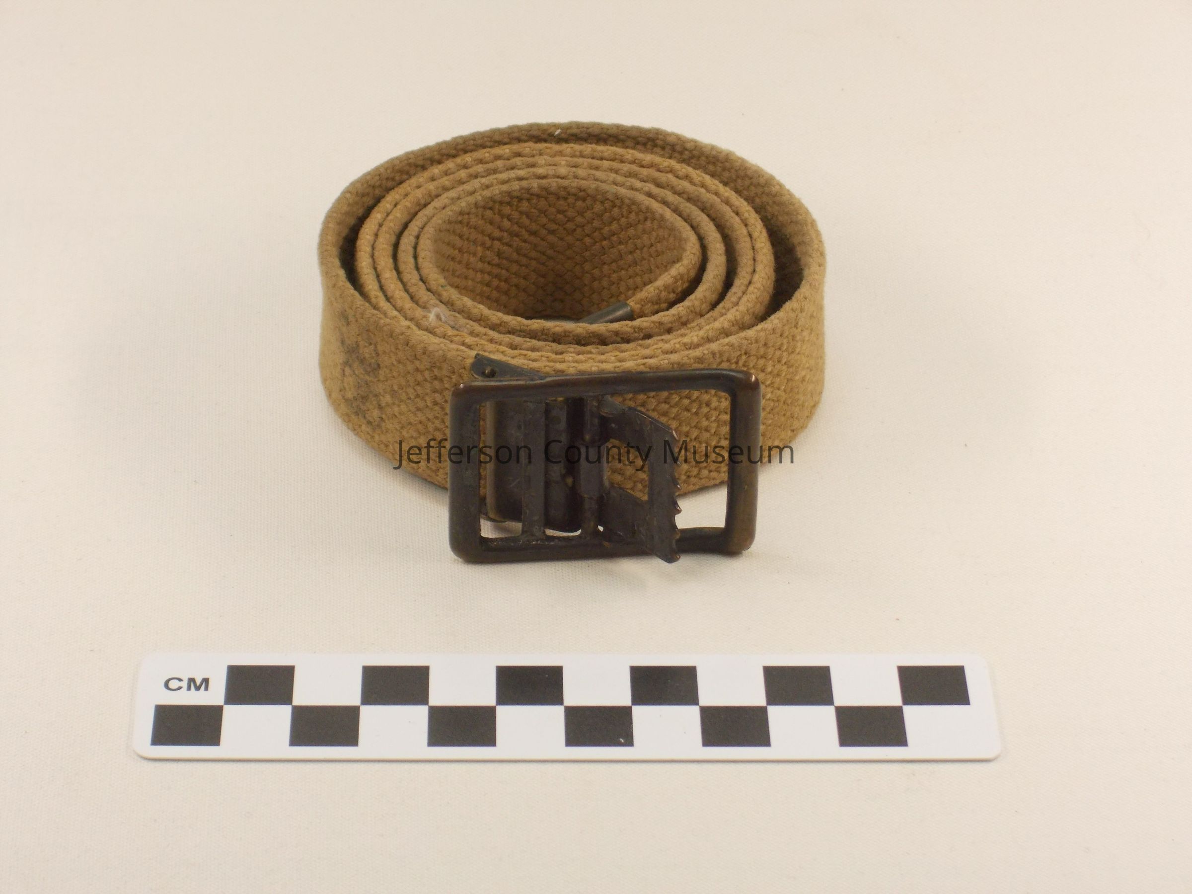 U.S. Army web belt for trousers, probably World War II (WWII). Metal cap on end. Clamp style grab buckle. Stencilled near buckle "38". On buckle is "ANCHOR BRAND" with an anchor below.Acquisition