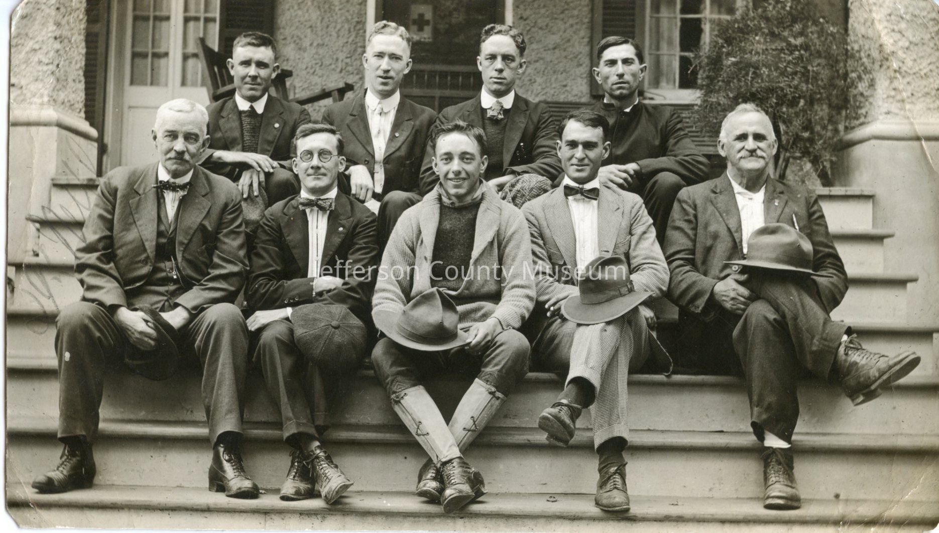 Seven limited service members drafted September 6, 1918 with Dr. William Neill on left front row and Capt. Getzendanner on right of front row. Site is the front steps of the Getzendanner House, 307 East Washington Street. Written on reverse "World War I Limited Service men drafted Sept. 6/18, Ben Shugart next to me" in another hand "Dr. Neil - Medical Examiner".Acquisition
