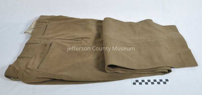 World War II (WWII) OD (olive drab) brown uniform pants. Button fly, belt loops. Small label inside near belt line "W32 L35".Acquisition