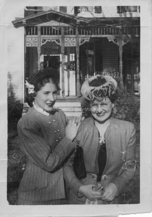 Barbara Tanquary Shugart (left) and Mildred Whedon Shugart in front of Barbara Shugart's home at 633 South Samuel Street, Charles Town (Leland and Mildred Whedon Shugart operated C. T. Shugart and Son clothing and dry goods store in Charles Town.)