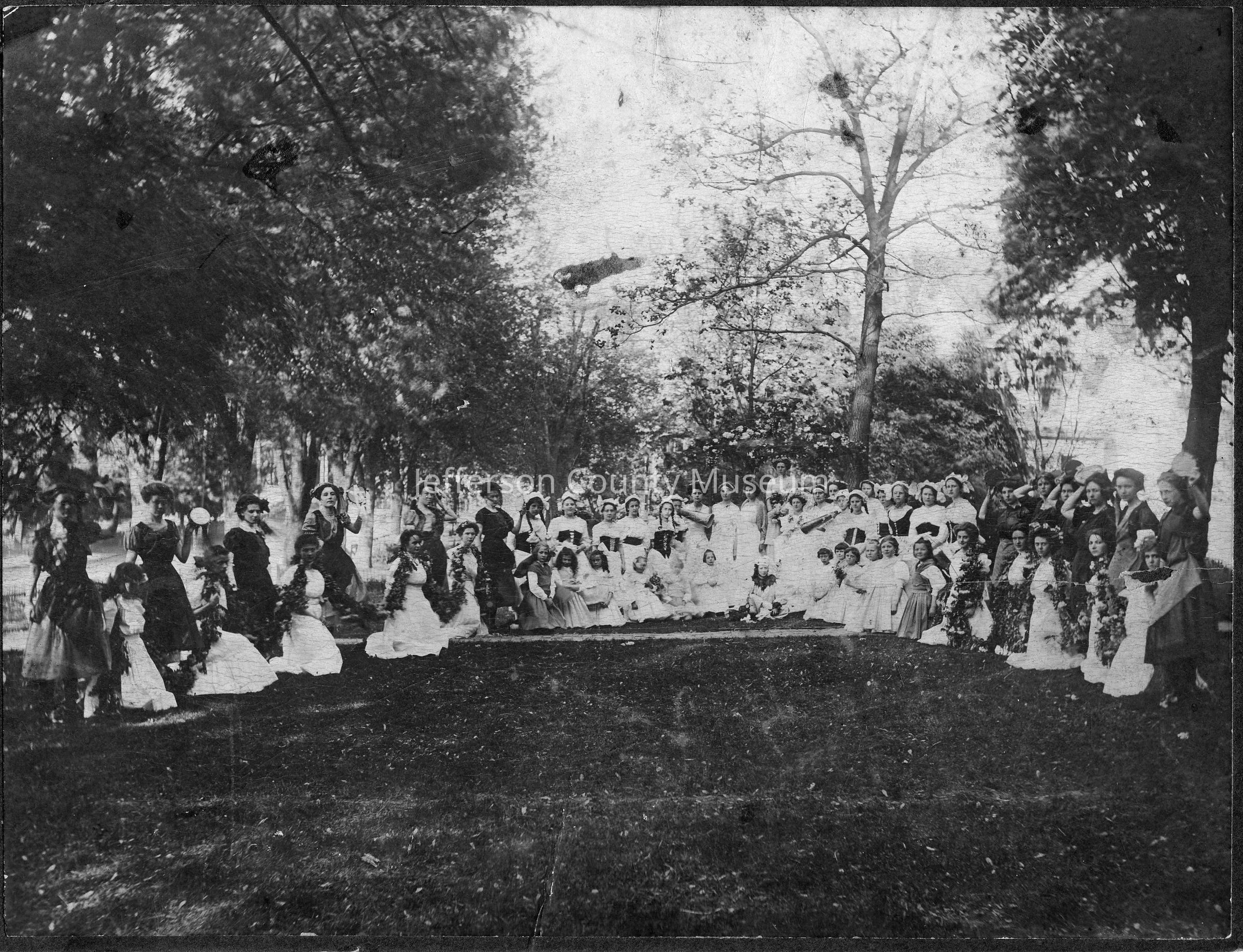 Large gathering of women and children; verso reads Virginia, Myra, and Mary Shutt