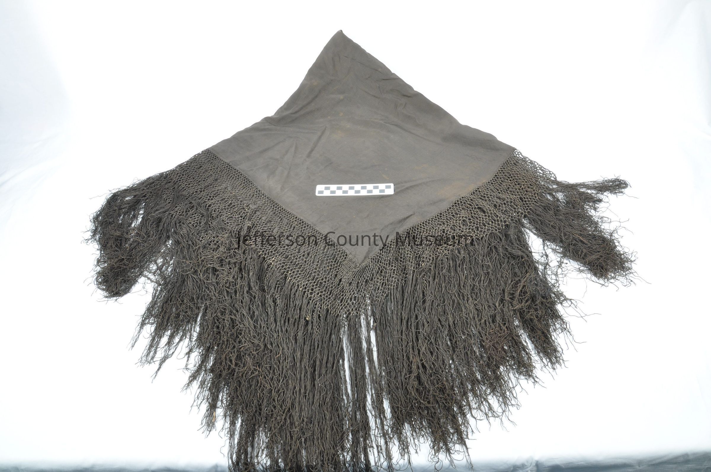 Black silk shawl with hand-knotted fringe. Owned by Henrietta Waugh, 1787-1864.